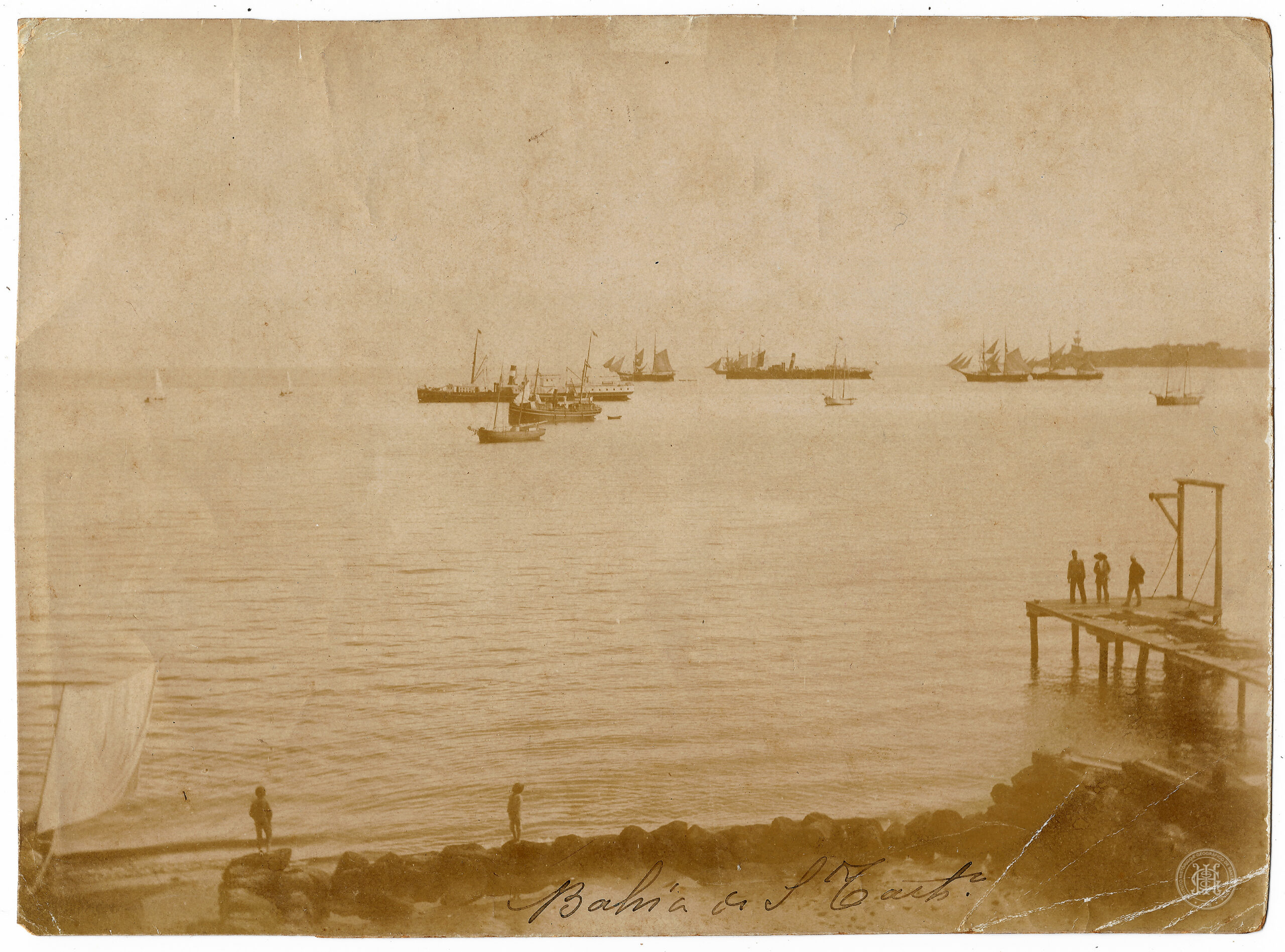 O plano médio é dominado pela extensão das águas da baía, onde diversas embarcações de diferentes tipologias estão ancoradas ou em trânsito. Identificam-se navios a vapor com chaminés centrais, embarcações de grande porte com múltiplos mastros (veleiros) e pequenos botes a remo localizados mais próximos à costa. Ao fundo, a linha do horizonte revela uma faixa de terra contínua à direita, correspondente à porção continental ou insular da região. A composição apresenta perspectiva profunda e iluminação solar direta, que gera reflexos na superfície calma da água. Na margem inferior central da imagem, consta a inscrição manuscrita "Bahia de S. Cath".