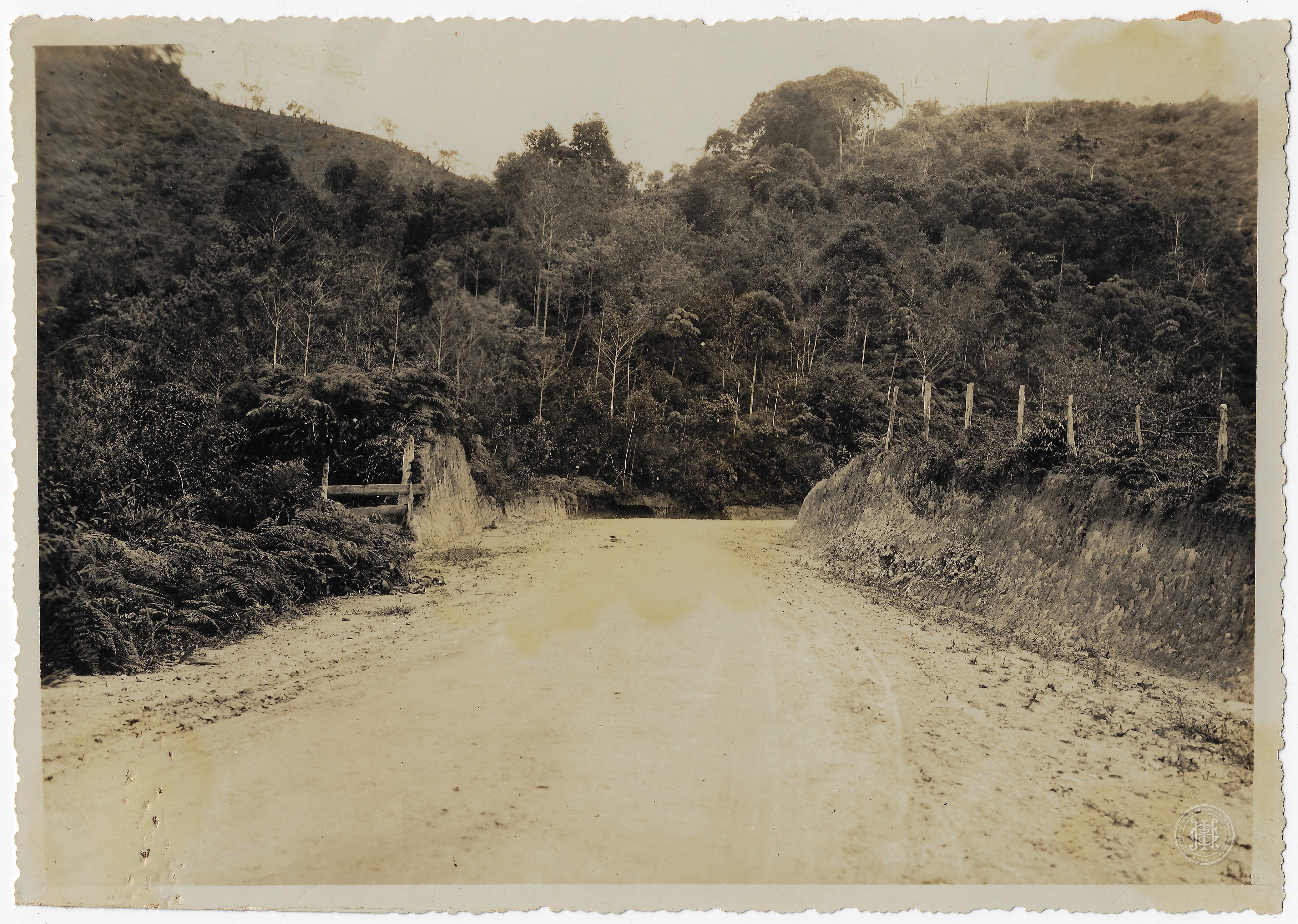 A composição é centralizada na via, que apresenta textura arenosa e marcas de rodagem, ladeada por taludes de terra. No primeiro plano à esquerda, observa-se uma cerca de madeira rústica e vegetação densa composta por samambaias e arbustos. À direita, o talude é acompanhado por uma cerca de arame farpado com palanques de madeira visíveis em perspectiva.