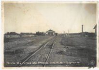 Jaguaruna, Santa Catarina, Morro Grande, Estrada de Ferro Donna Thereza Christina, Via férrea, Trilhos, Dormentes, Transporte ferroviário, Infraestrutura, Perspectiva, Ponto de fuga, Paisagem, Campos alagados, Vegetação rasteira, Relevo, Morro, Urbanização incipiente, Patrimônio edificado, Cerca de arame, Registro histórico, Fotografia documental, Municípios catarinenses, Sul do Brasil.