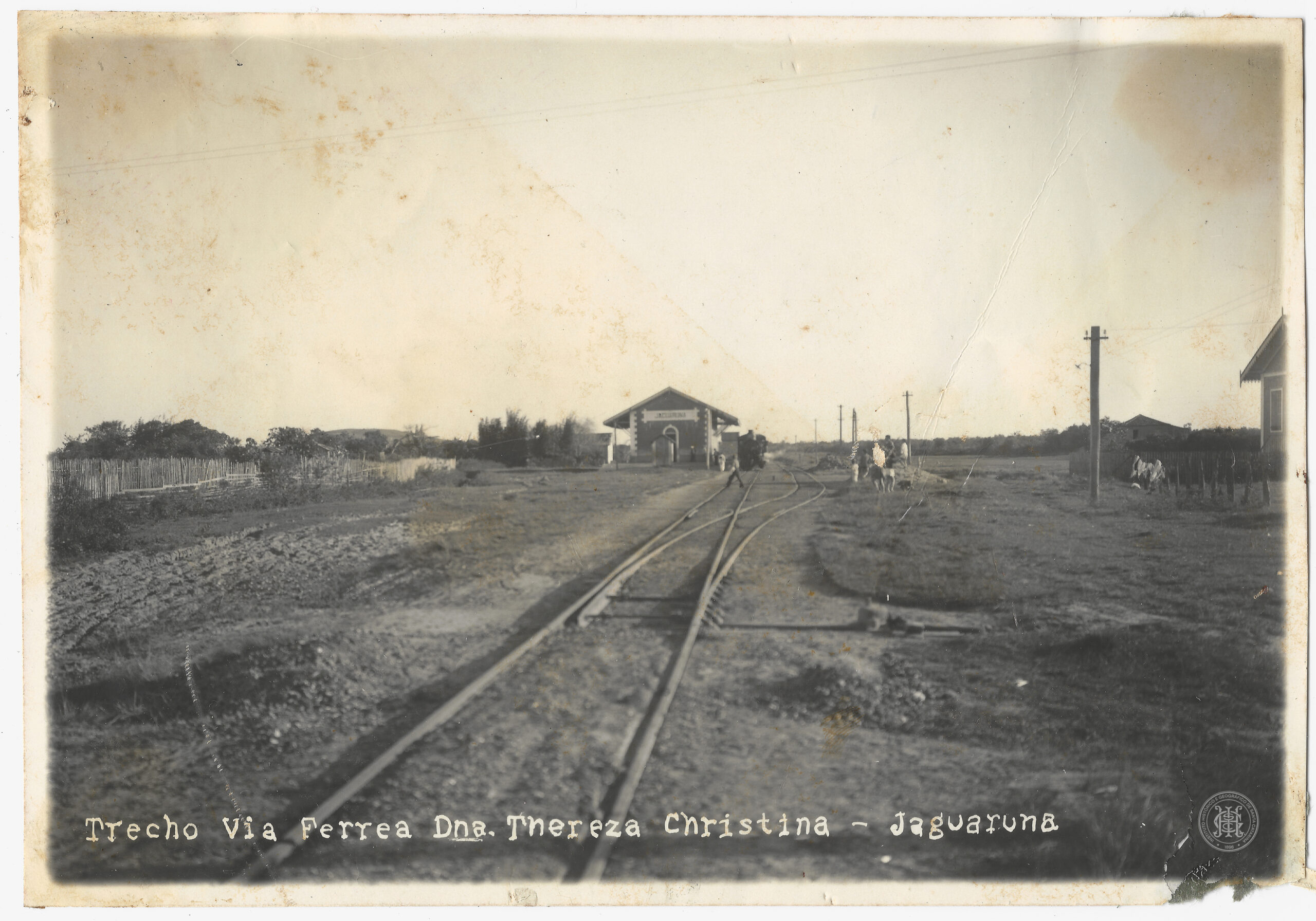 O céu ocupa a metade superior da imagem, apresentando-se claro e uniforme. No anverso, no canto inferior esquerdo, consta a legenda impressa em branco: "Trecho Via Férrea Dna. Thereza Christina - Jaguaruna".