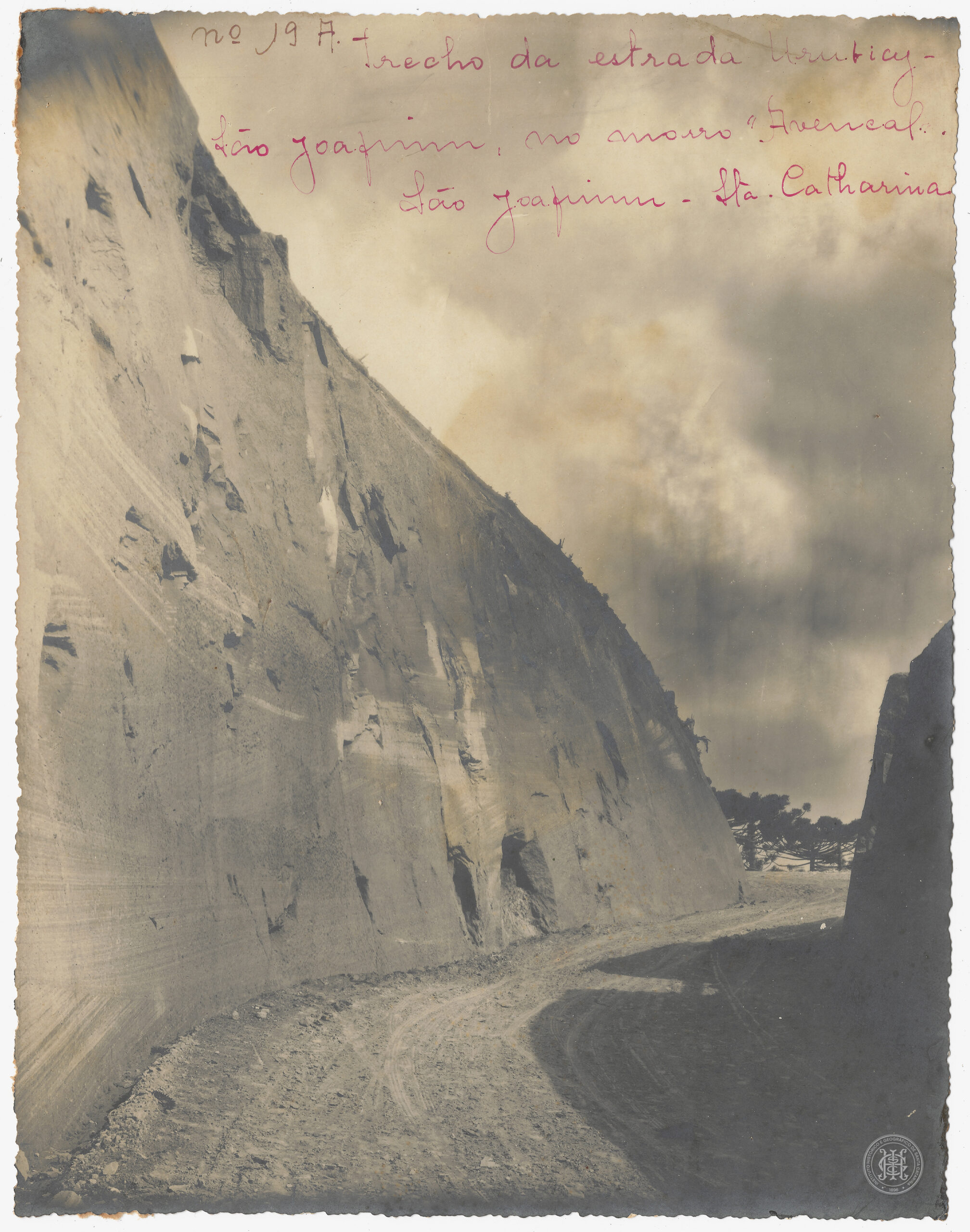 Na parte superior da imagem, há uma extensa inscrição manuscrita à tinta rosa, integrada organicamente ao suporte fotográfico, que identifica a cena: "nº 19 A. - Trecho da estrada Urubici - São Joaquim, no morro 'Avencal' / São Joaquim - Sta. Catharina". A fotografia utiliza um ângulo de visão que enfatiza a magnitude da obra de engenharia viária frente ao relevo acidentado, registrando a transformação da paisagem natural para a implementação de infraestrutura de transporte na região serrana.