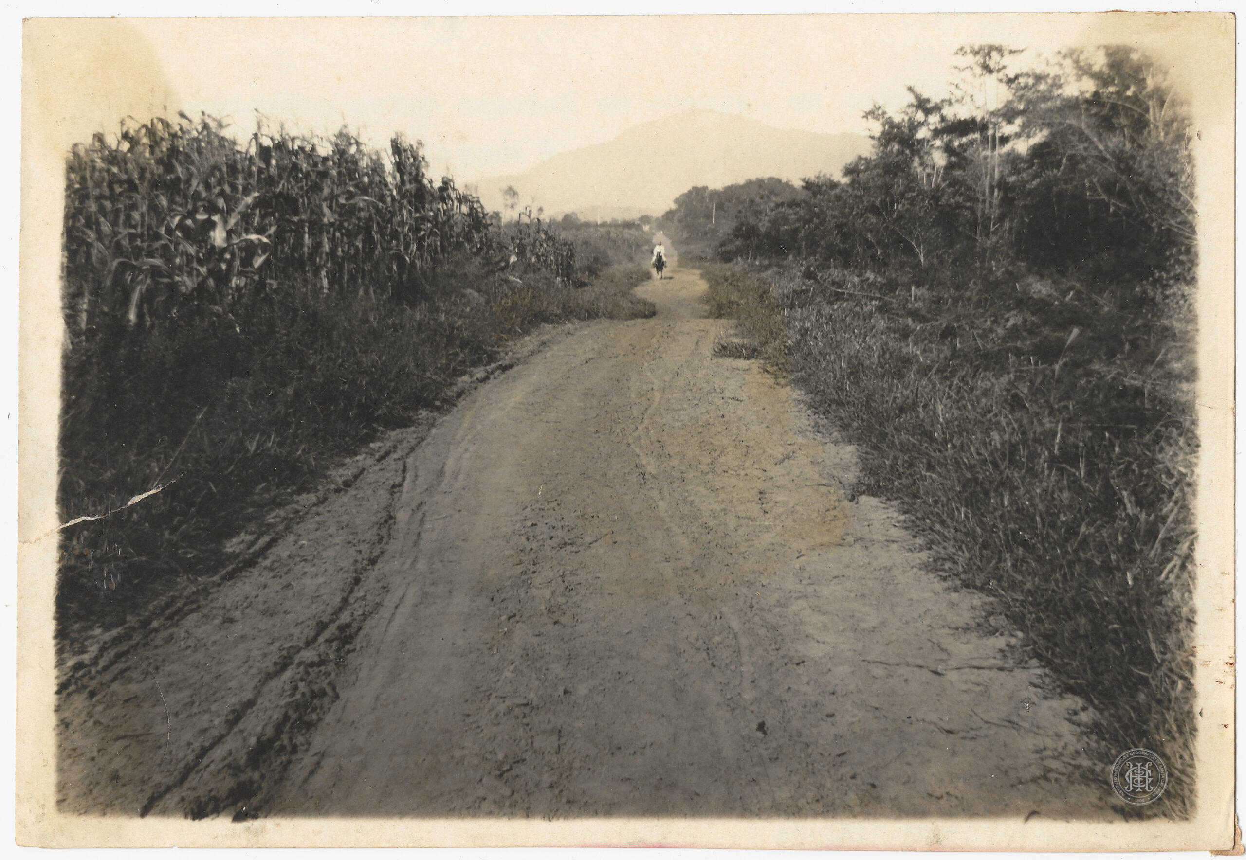 No plano médio, à esquerda, observa-se uma plantação de milharal; à direita, a via é margeada por vegetação arbustiva e gramíneas. Ao centro do plano médio nota-se a presença de uma pessoa montada em um equino.
