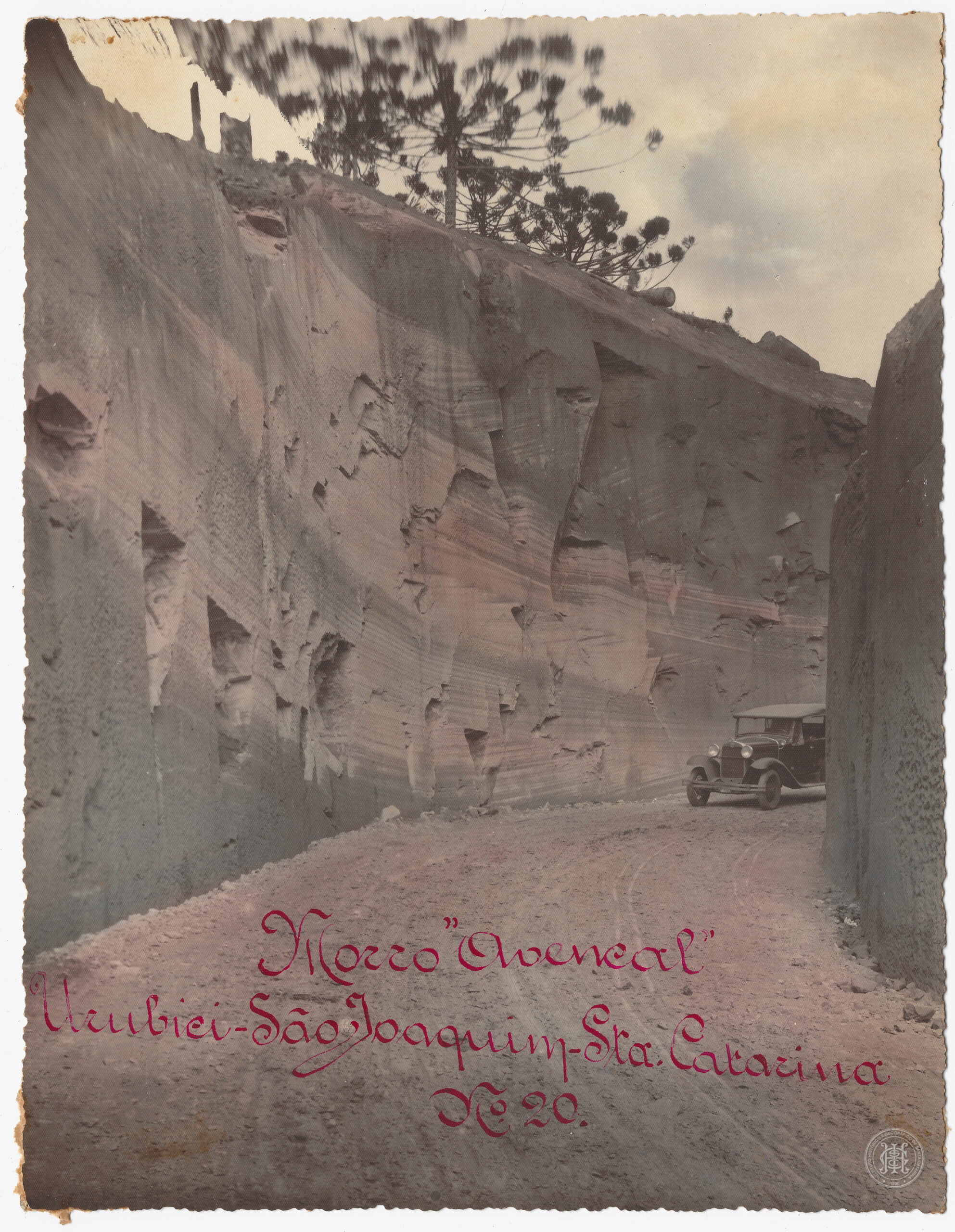Paisagem, Paisagem de Morro, Morro do Avencal, Relevo, Encosta, Corte de Rocha, Escavação, Rodovias e Estradas, Infraestrutura e Engenharia, Obras Viárias, Estrada de Terra, Automóvel Antigo, Veículo, Transporte, Elementos Naturais, Araucária, Urubici, São Joaquim, Santa Catarina, Serra Catarinense, Fotografia Documental