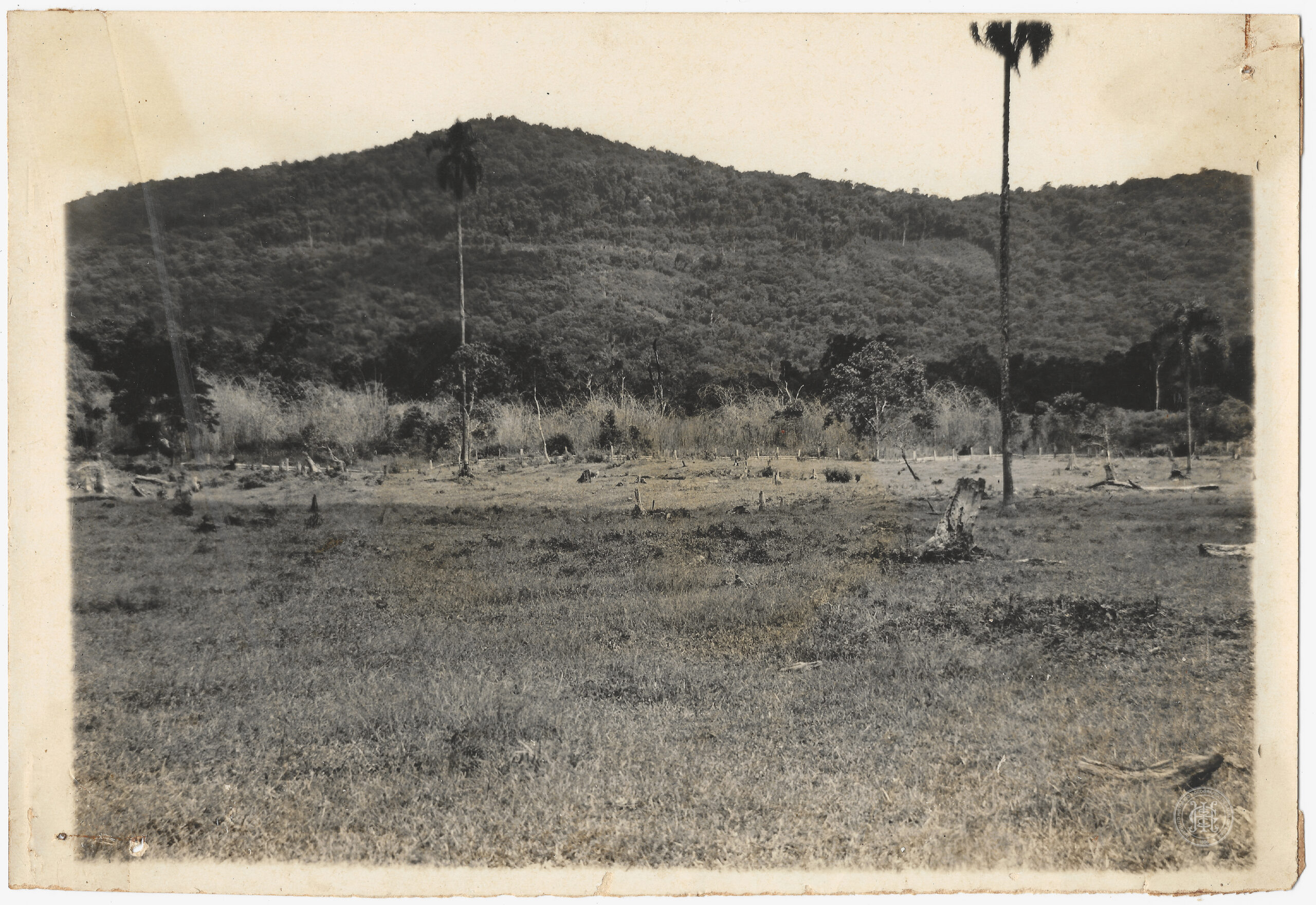 No plano médio, a área de pastagem é delimitada por uma linha de vegetação arbustiva e árvores isoladas, com destaque para duas palmeiras de grande porte que se verticalizam na composição — uma centralizada e outra posicionada à direita, cujo topo ultrapassa o limite superior do enquadramento.