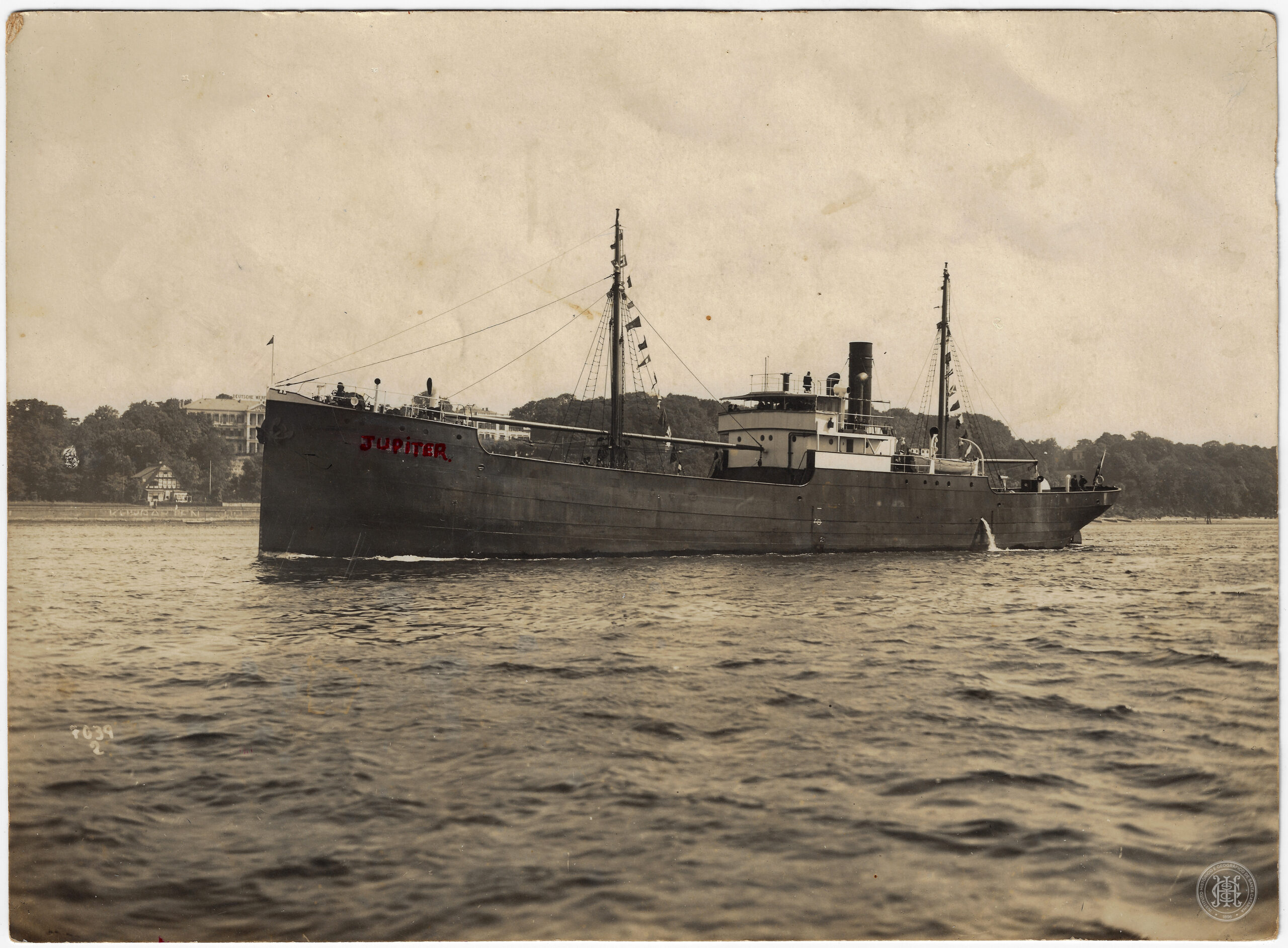 Verso: Vapor comprado pela praça de Laguna. 60 metros de comprimento; deslocamento: 1050 Ton. milhas 9 p. h. custou: compraste 1050; 12.000 libras est. um sócio de Kremphoff – cap. Antonio Baptista da Silva, Luiz Martins da Fonseca e Dr. Claribalte Galvão. p. Laguna – Itajahy, S. F. – Rio. (Firma Baptista + Cia). V. sahiu de Hambg. – 1º Nov – 26 – ao Rio e 4 p Laguna. Atelier L. & A. Schaul, Hamburg, Steinstrasse 147, "Jacobi Haus". IHG-FOT-1173.