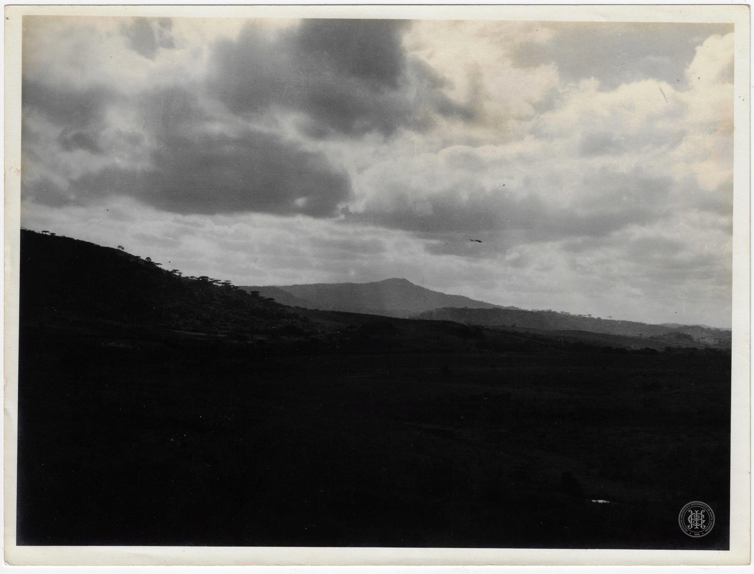 Vasta paisagem natural montanhosa em Santa Catarina. A imagem é dominada por um céu nublado, que ocupa a metade superior do enquadramento, com densas e variadas formações de nuvens cumuliformes cobrindo a maior parte da extensão celeste. No primeiro plano, estende-se uma área plana de vegetação, possivelmente um campo ou pastagem, que aparece em silhueta escura e sem detalhamento.