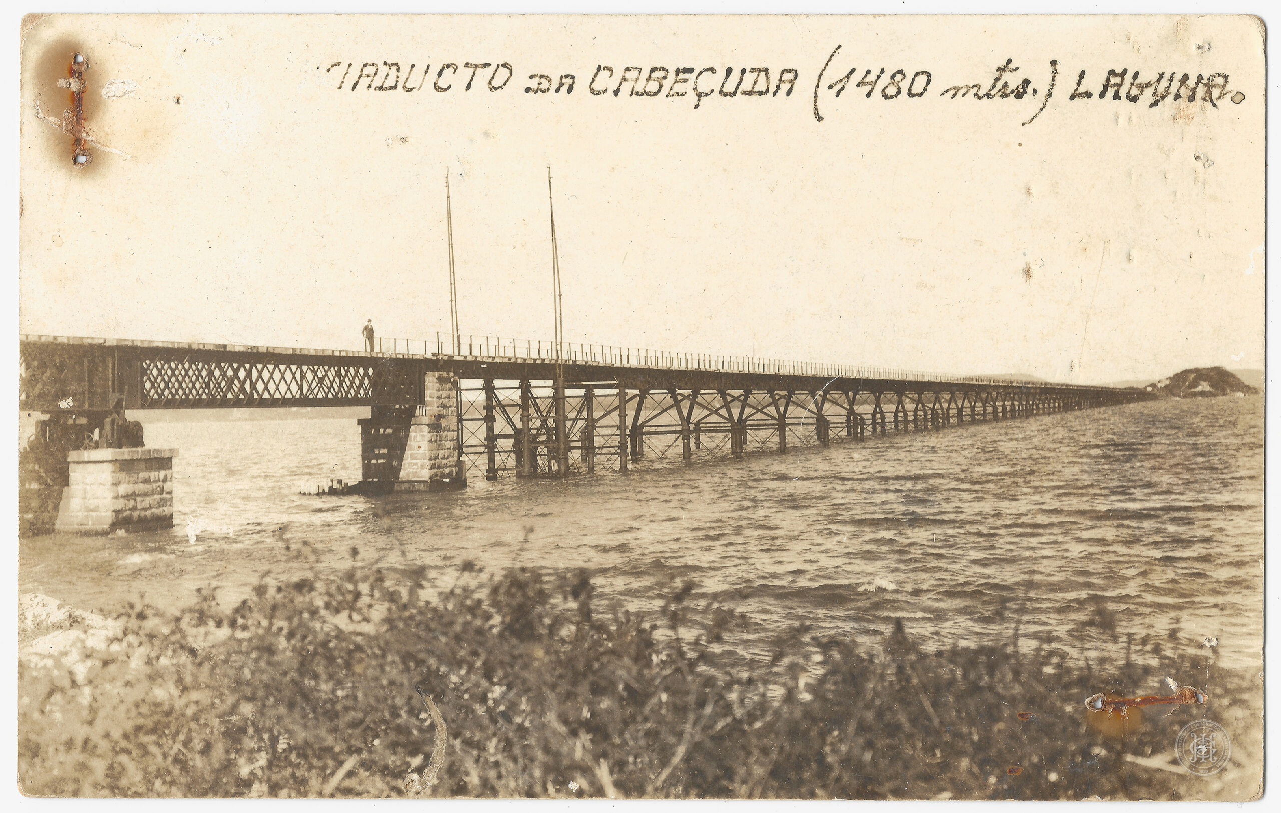 As águas apresentam pequenas ondulações, indicando movimento. Ao fundo, à direita, identifica-se uma pequena elevação de terra ou ilha com vegetação. No quadrante superior, consta a inscrição manuscrita em letras pretas: VIADUCTO DA CABEÇUDA (1480 mtrs.) LAGUNA.
