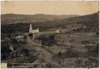 Vila de Nova Beluno, Siderópolis, Urussanga, Santa Catarina, Paisagem rural, Vista panorâmica, Núcleo urbano, Igreja Matriz, Torre sineira, Arquitetura religiosa, Edificações de madeira, Casas térreas, Chaminé, Estrada de terra, Logradouro rural, Cercas de madeira, Áreas de cultivo, Vegetação, Morros, Relevo, Agfa-Lupex, Fotografia documental, Registro histórico, Imigração italiana