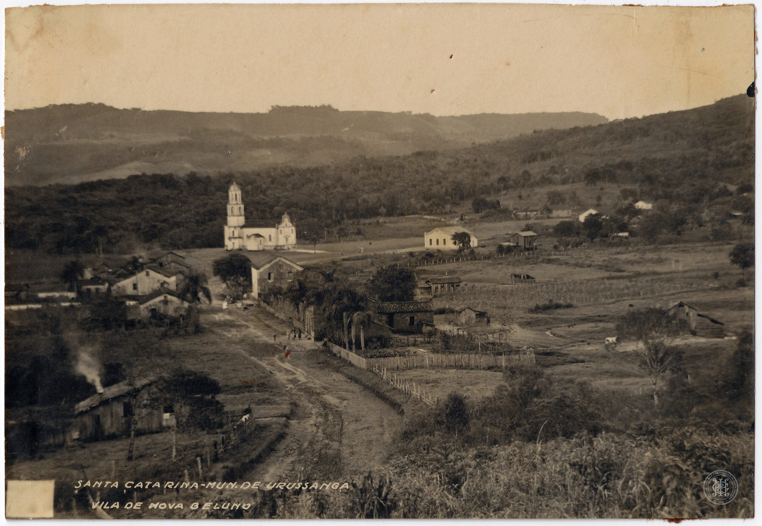 O elemento arquitetônico de maior relevância é a Igreja Matriz, situada em plano elevado ao fundo, apresentando uma torre sineira proeminente e fachada em tons claros. A paisagem de fundo é composta por extensas encostas e morros cobertos por vegetação densa, sob um horizonte de linhas suaves. No canto inferior esquerdo do anverso, consta a legenda impressa em letras brancas: "SANTA CATARINA-MUN. DE URUSSANGA / VILA DE NOVA BELUNO".