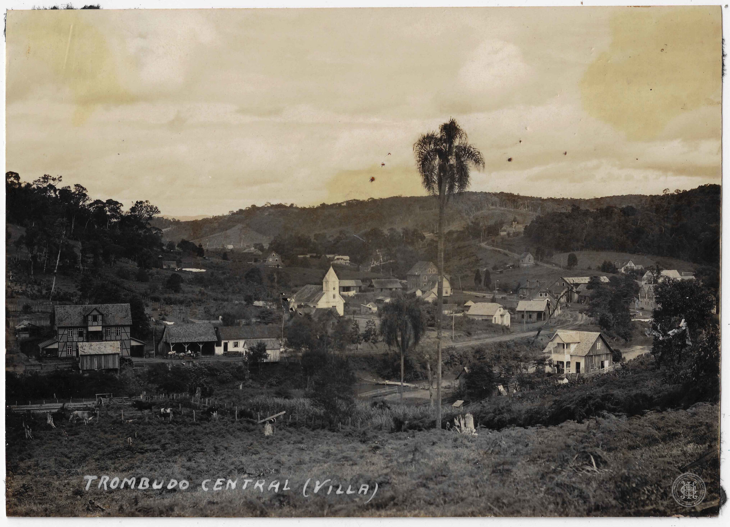 Vista panorâmica da Villa de Trombudo Central, em Rio do Sul, Santa Catarina. A composição organiza-se com um terreno gramado e cercas de madeira em primeiro plano, que conduzem o olhar para o núcleo urbano disperso no plano médio.