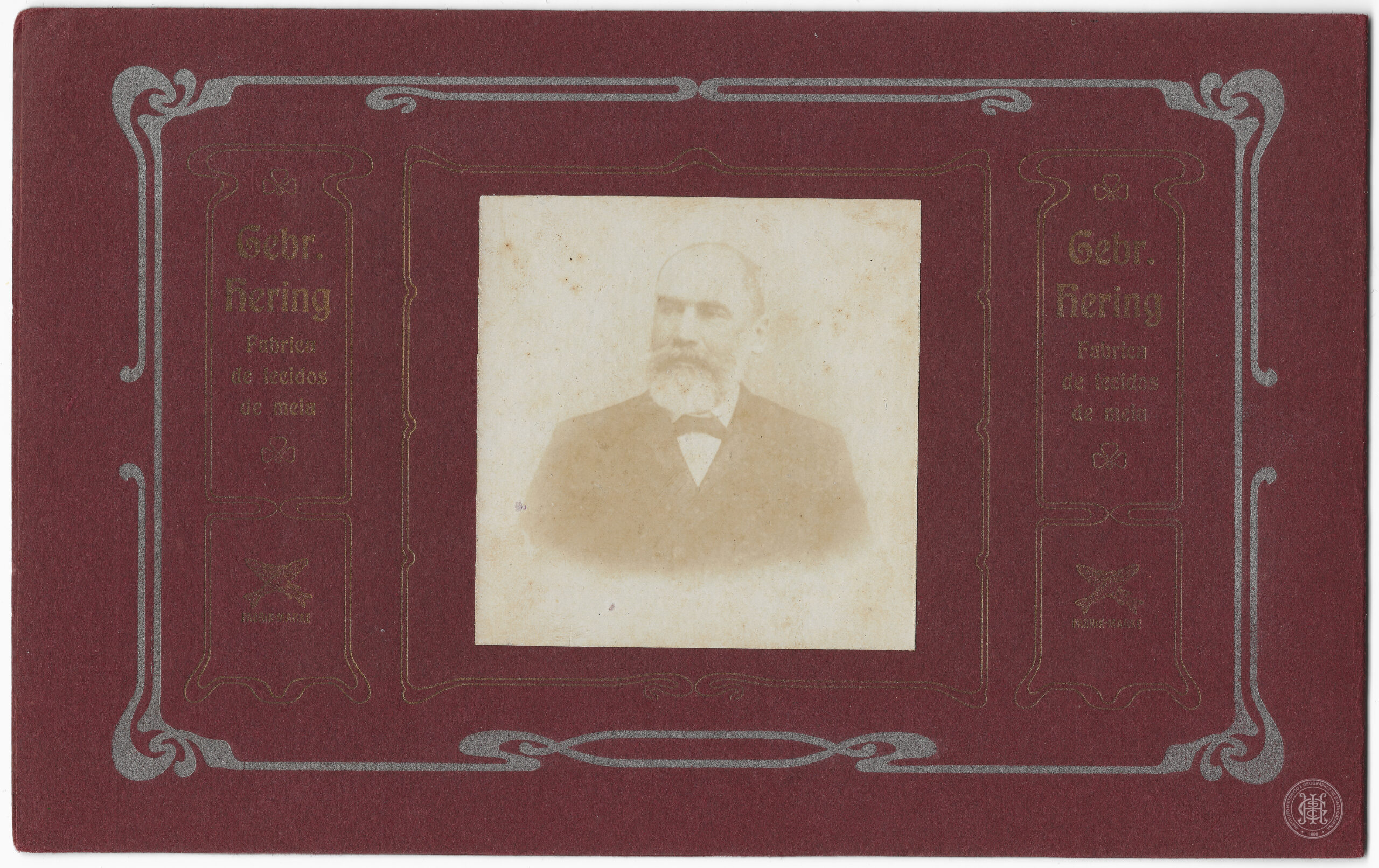 A imagem fotográfica, de tonalidade sépia e bordas esfumaçadas, está inserida em um suporte de cartão rígido de cor grená, decorado com molduras e ornamentos em estilo Art Nouveau na cor prata. Nas laterais da fotografia, constam inscrições impressas em dourado dispostas simetricamente, contendo o nome "Gebr. Hering", seguido por "Fabrica de tecidos de meia", encimadas por um trevo de três folhas e finalizadas por um logotipo com dois peixes cruzados e a inscrição "FABRIK-MARKE". O suporte apresenta uma moldura retangular interna em relevo seco circundando o retrato.