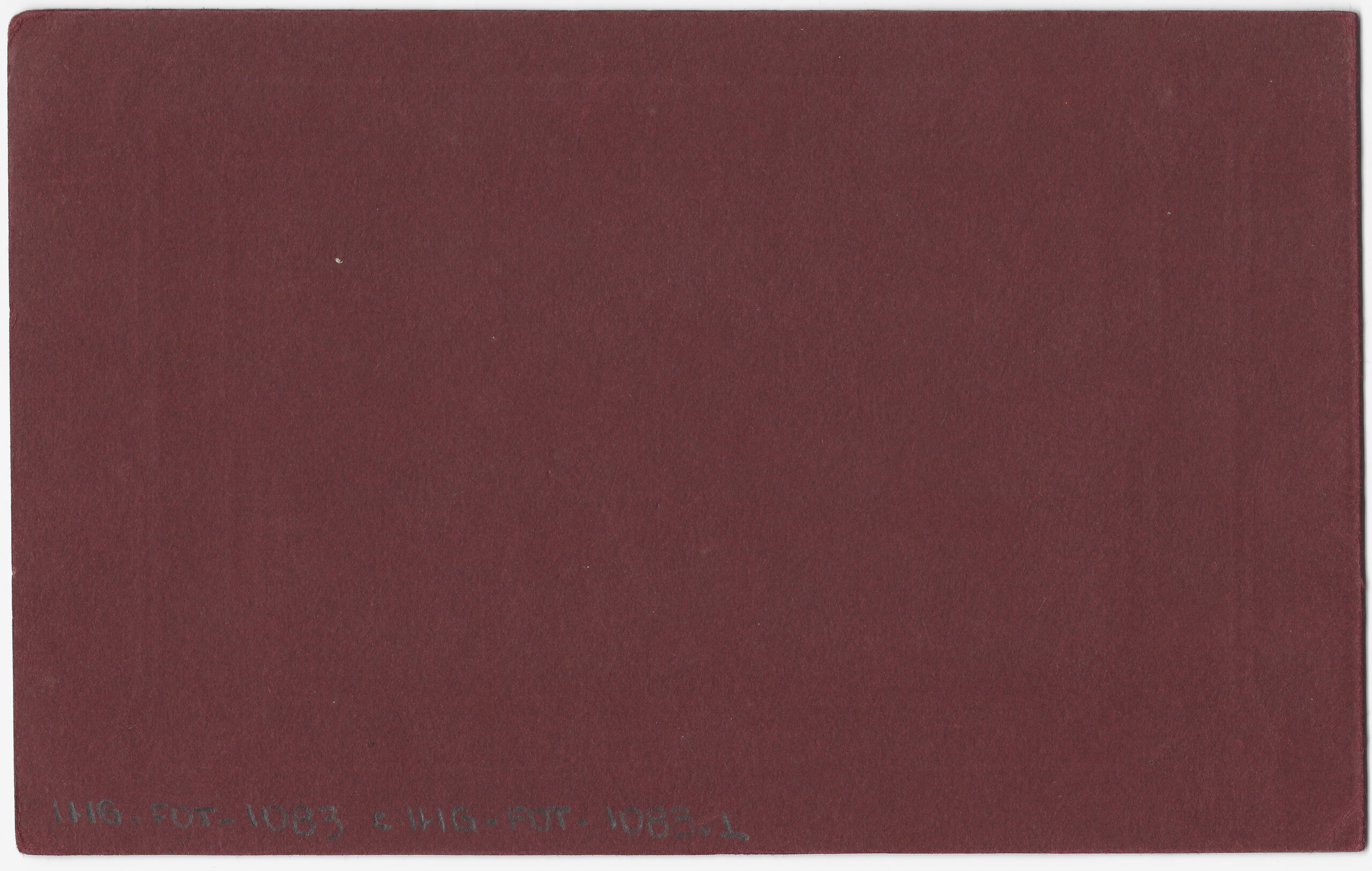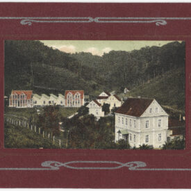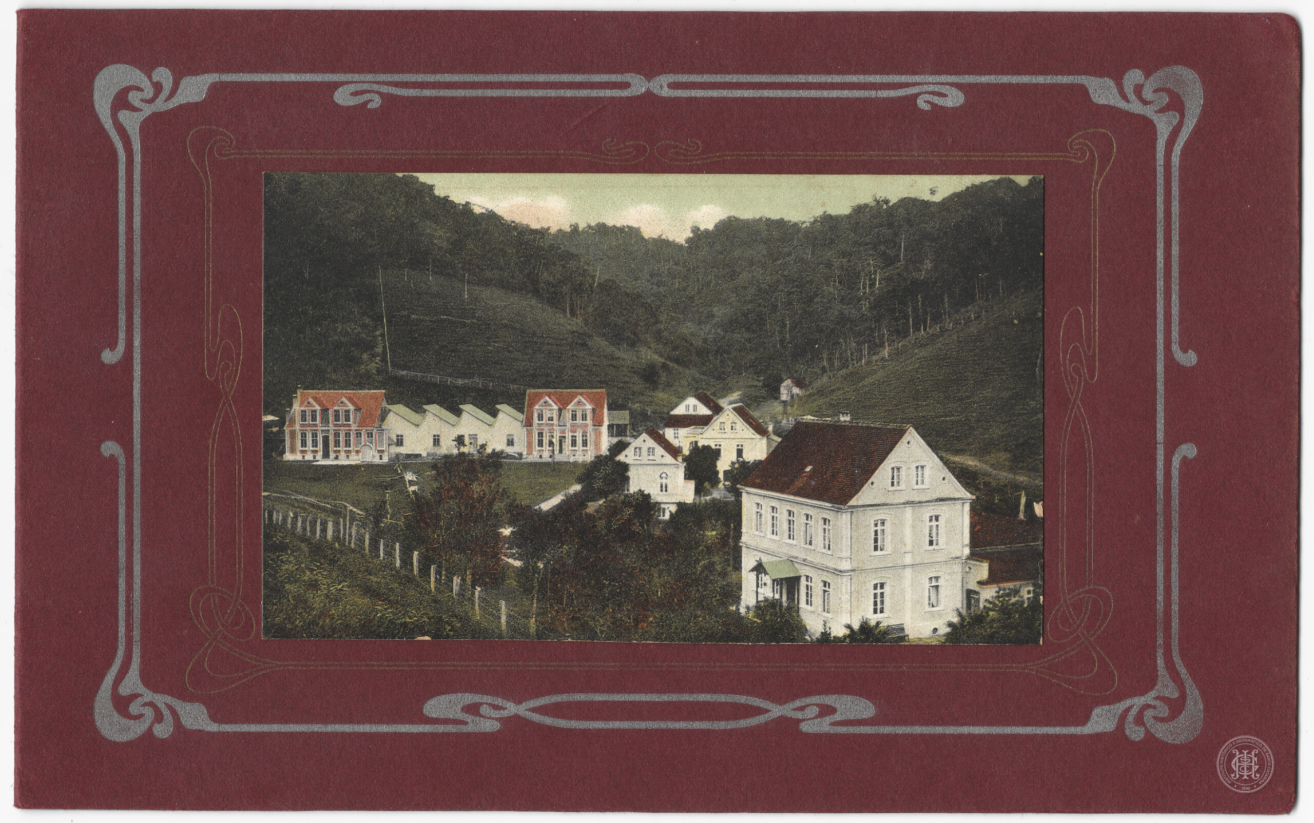 Uma cerca de madeira delimita a área gramada que separa as construções. Ao fundo, a paisagem é dominada por encostas de morros cobertas por vegetação densa. A imagem está inserida em um suporte de cartão rígido na cor grená, com moldura decorativa em estilo Art Nouveau na cor prata e uma moldura retangular interna em relevo seco que circunda a fotografia.