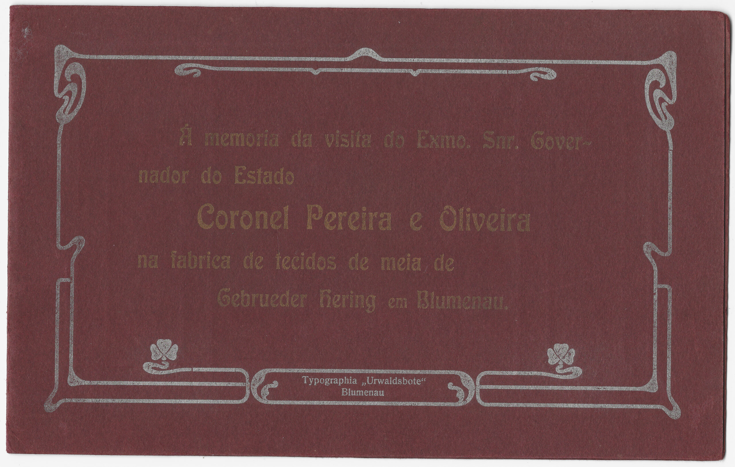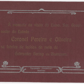 Verso1 : Á memoria da visita do Exmo. Snr. Gover- nador do Estado Coronel Pereira e Oliveira na fabrica de tecidos de meia de Gebrueder Hering em Blumenau. Typographia „Urwaldsbote“ Blumenau