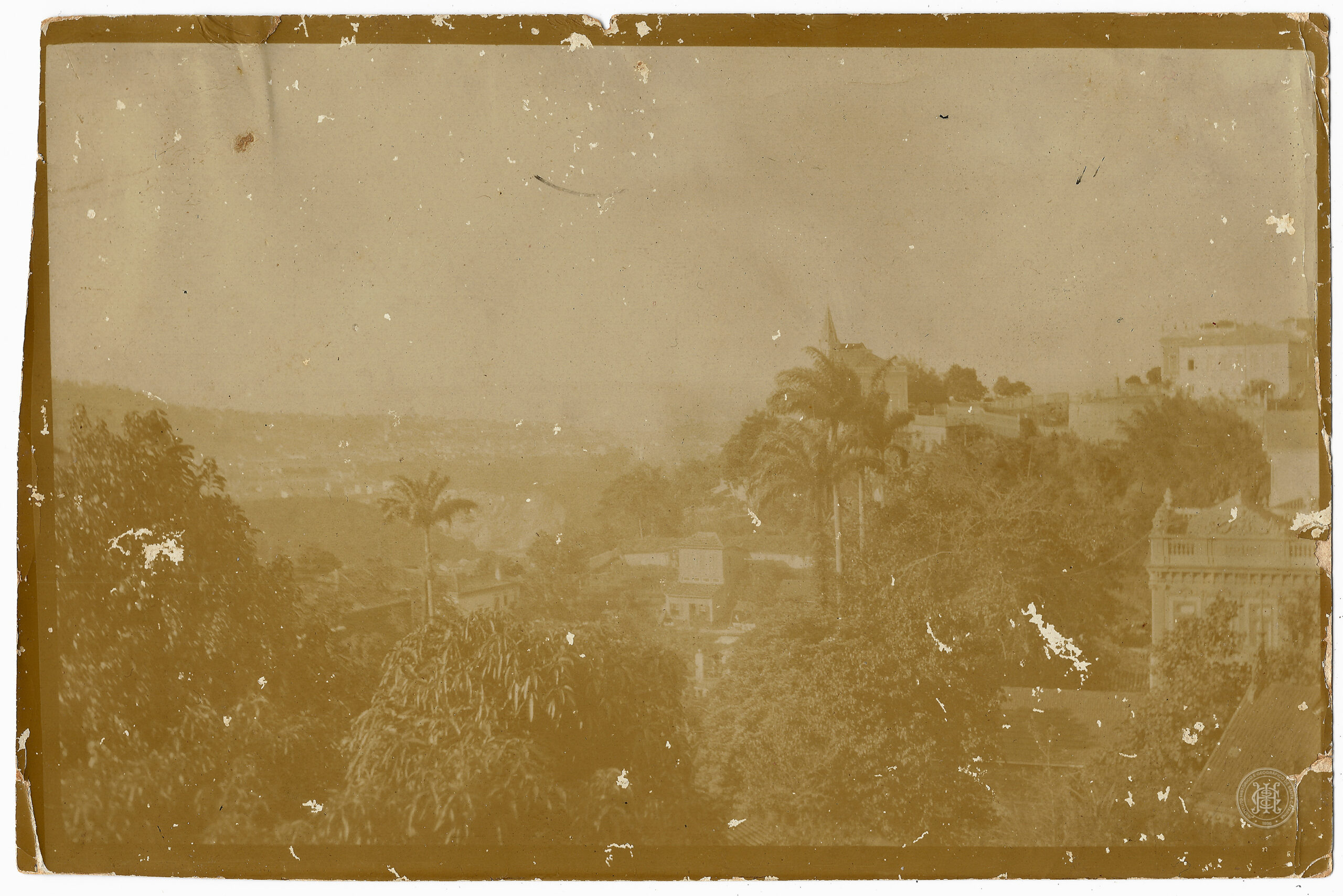 Vista panorâmica parcial da cidade de Desterro, atual Florianópolis, no ano de 1898. A composição é capturada a partir de um ponto elevado, organizando-se em múltiplos planos que revelam a transição entre a densa vegetação e o núcleo urbano em desenvolvimento. No primeiro plano, destaca-se uma massa de vegetação arbórea com folhagens variadas que ocupam a base e a lateral esquerda da imagem. À direita, em plano médio, observa-se a arquitetura eclética de um edifício imponente com balaustradas e ornamentos em relevo, identificado como o Palácio Cruz e Sousa. Acima deste, a composição segue pela Rua Marechal Guilherme, onde se nota a torre pontiaguda da Igreja Luterana e, em frente, a estrutura do Colégio Lauro Müller.
