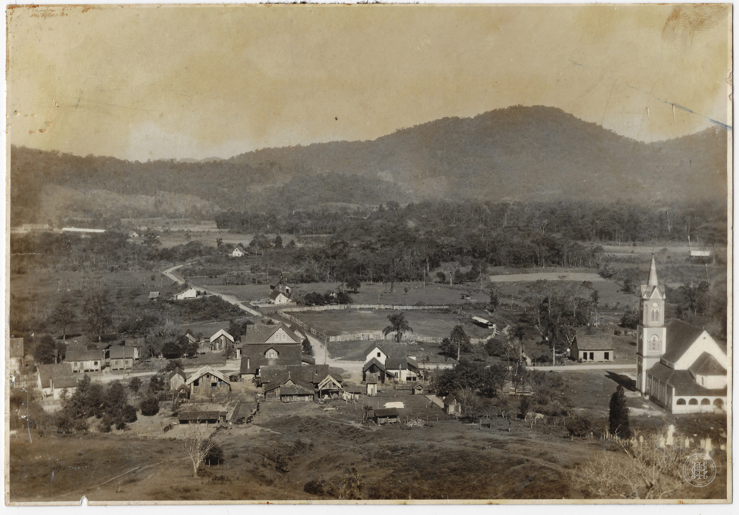 Vista aérea, Villa de Bananal, Joinville, Santa Catarina, Núcleo urbano, Urbanização, Igreja, Torre sineira, Arquitetura religiosa, Edificações de madeira, Residências, Estrada de terra, Pastagens, Áreas rurais, Relevo, Montanhas, Serra, Vegetação, Mata Atlântica, Setembro de 1939, Século XX, Fotografia documental, Paisagem urbana, Patrimônio edificado, Paisagem e Elementos Naturais