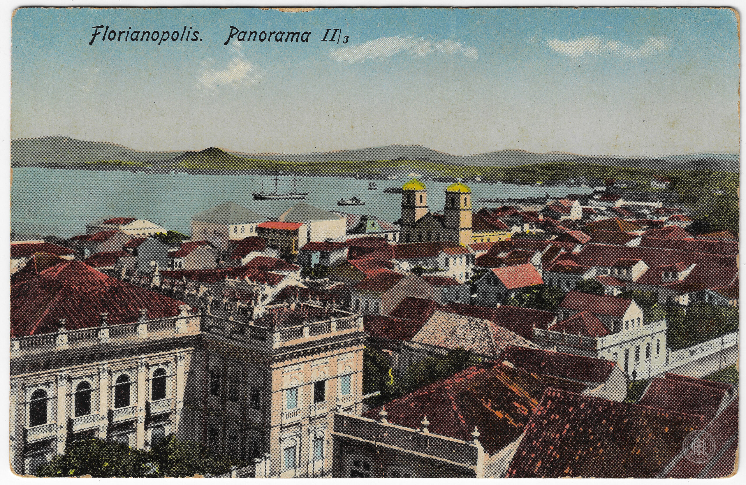 Vista aérea parcial de Florianópolis, identificada no suporte como "Florianopolis. Panorama II/3". A composição organiza-se a partir de um ângulo elevado, destacando em primeiro plano, à esquerda, a arquitetura eclética do Palácio do Governo (atual Palácio Cruz e Sousa), com suas janelas em arco e platibandas ornamentadas. O casario da rua Tenente Silveira estende-se pelo plano médio, caracterizado por telhados de barro em tons de cerâmica e fachadas contíguas que remontam ao início do século XX, por volta de 1920. No centro do plano médio, sobressaem as duas torres sineiras da Igreja São Francisco, finalizadas com cúpulas de coloração amarelada.
