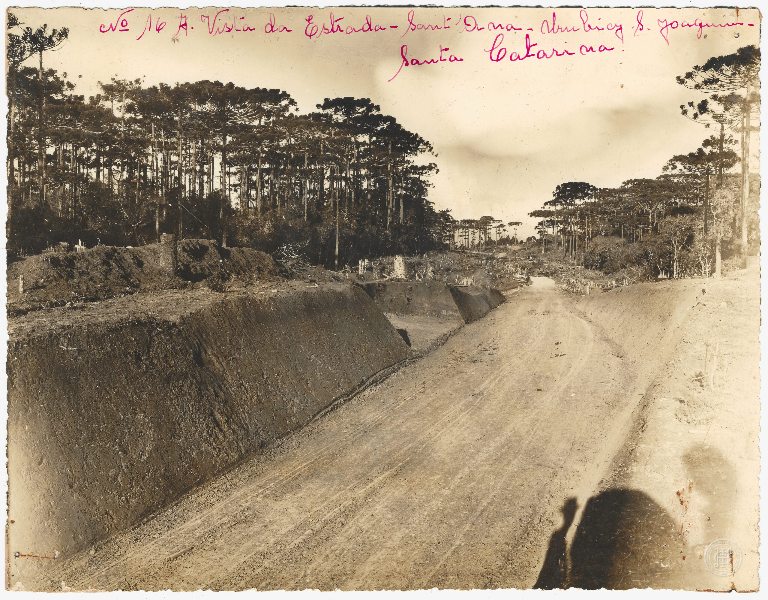 No topo da imagem, há uma inscrição manuscrita à tinta rosa que percorre quase toda a extensão horizontal do suporte, detalhando a localização e a numeração da tomada: "Nº 16 A. Vista da Estrada - Sant' Anna - Urubicy .S. Joaquim - Santa Catarina.".