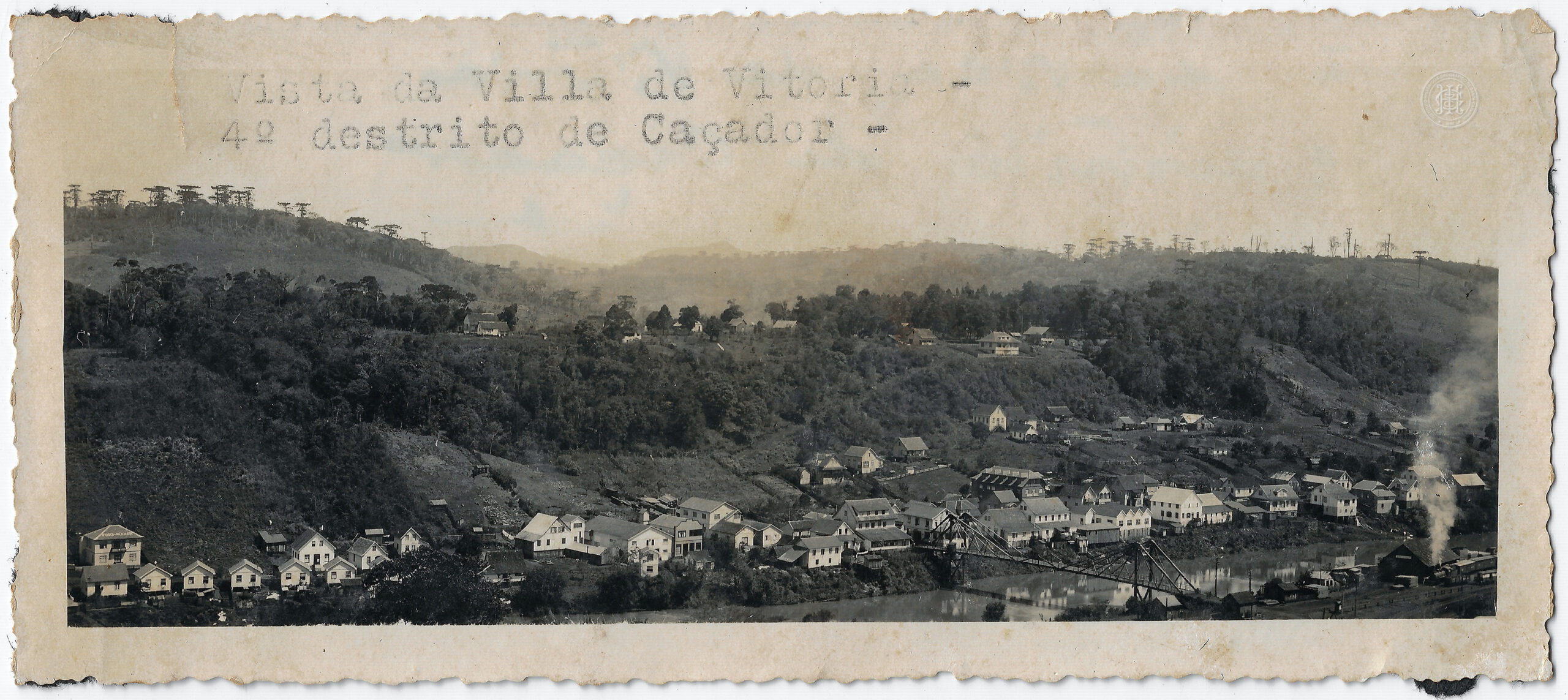 O plano de fundo é composto por encostas de morros com vegetação densa e a presença característica de araucárias (pinheiros-do-paraná) perfiladas contra o horizonte. Na parte superior central do anverso, consta a legenda impressa: "Vista da Villa de Vitoria - 4º destrito de Caçador".