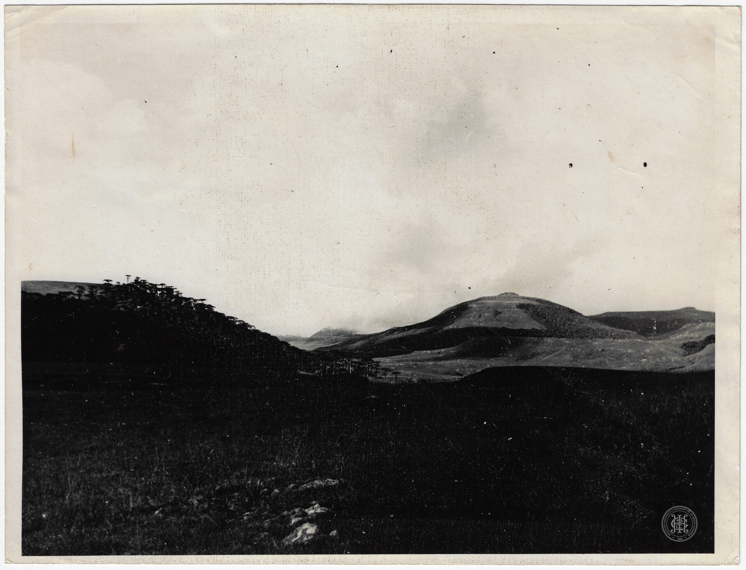 No plano médio, o relevo desce em direção a um vale onde se distingue uma área de lavoura organizada em linhas, demonstrando atividade agrícola. À direita, uma densa massa de vegetação nativa sobe a encosta adjacente, apresentando copas variadas.