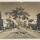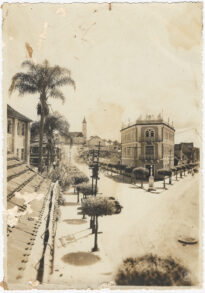 À frente deste edifício, encontra-se um monumento escultórico sobre pedestal em meio a uma fileira de árvores com copas podadas em formato arredondado. Na via, identifica-se a presença de um automóvel antigo estacionado e postes de madeira com fiação elétrica e luminárias. Ao fundo, em plano superior, destaca-se uma edificação religiosa com torre sineira e telhado de duas águas, situada em uma elevação do terreno.