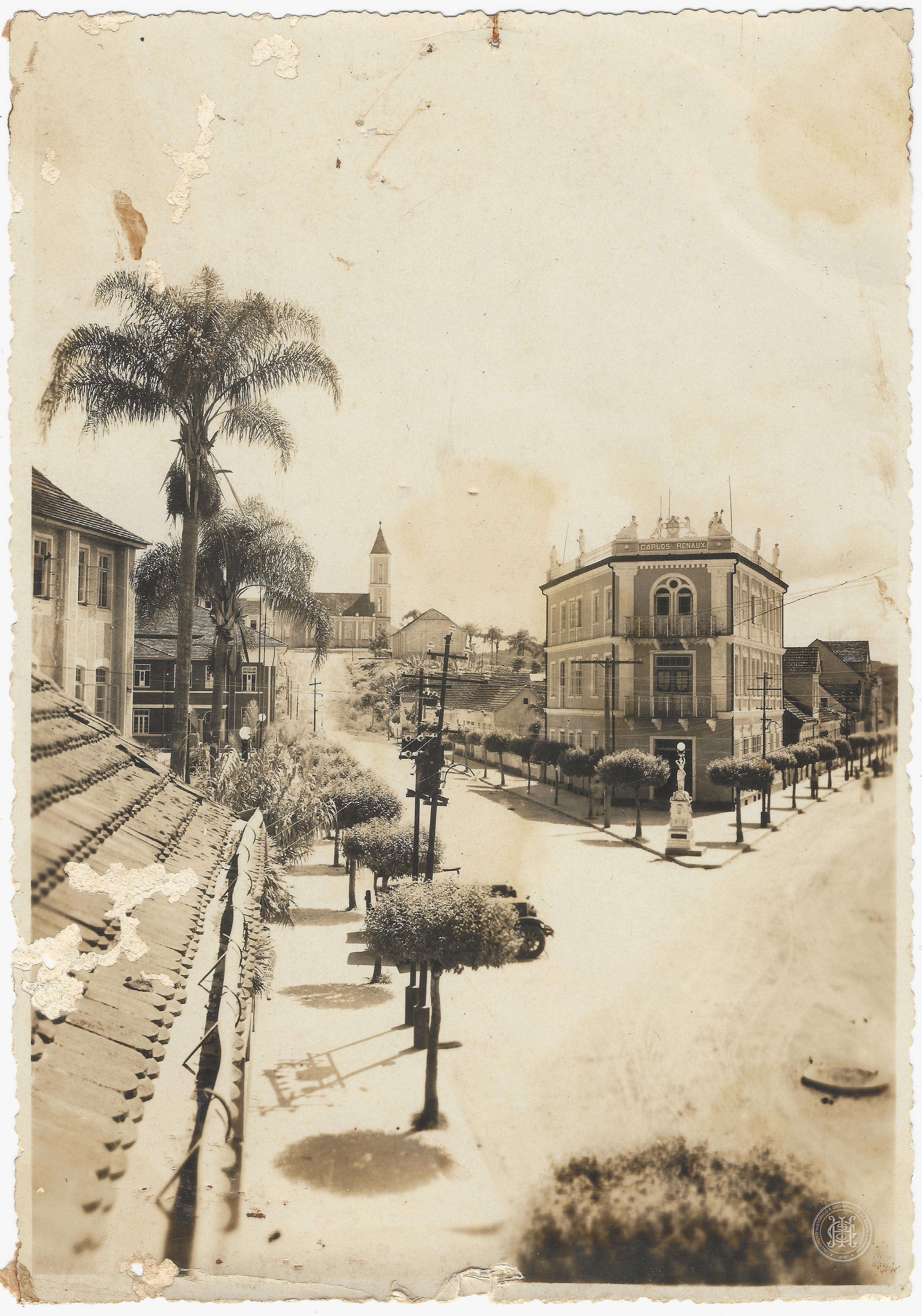 O plano médio é dominado por uma interseção de vias públicas com pavimentação clara, onde se observa o edifício comercial de três pavimentos denominado "CARLOS RENAUX", caracterizado por arquitetura eclética, com balcões de ferro, platibanda decorada com estatuetas e inscrições no topo.