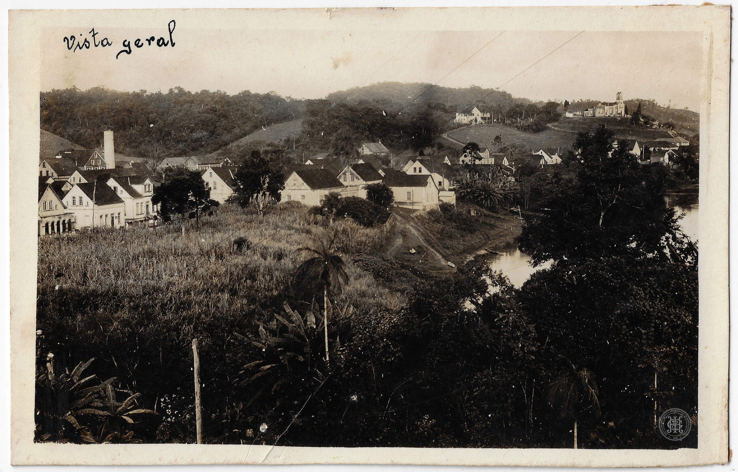 Ao fundo, à direita, no topo de uma elevação topográfica, situa-se uma edificação religiosa com torre sineira. A paisagem de fundo é completada por colinas recobertas por vegetação e uma porção de corpo d'água, o Rio Itajaí-Açu, visível à direita.