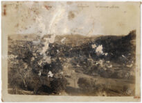 O plano de fundo é dominado por uma sucessão de morros com vertentes cobertas por florestas, sob um céu de tonalidade clara. A margem superior do anverso apresenta inscrições manuscritas a grafite.