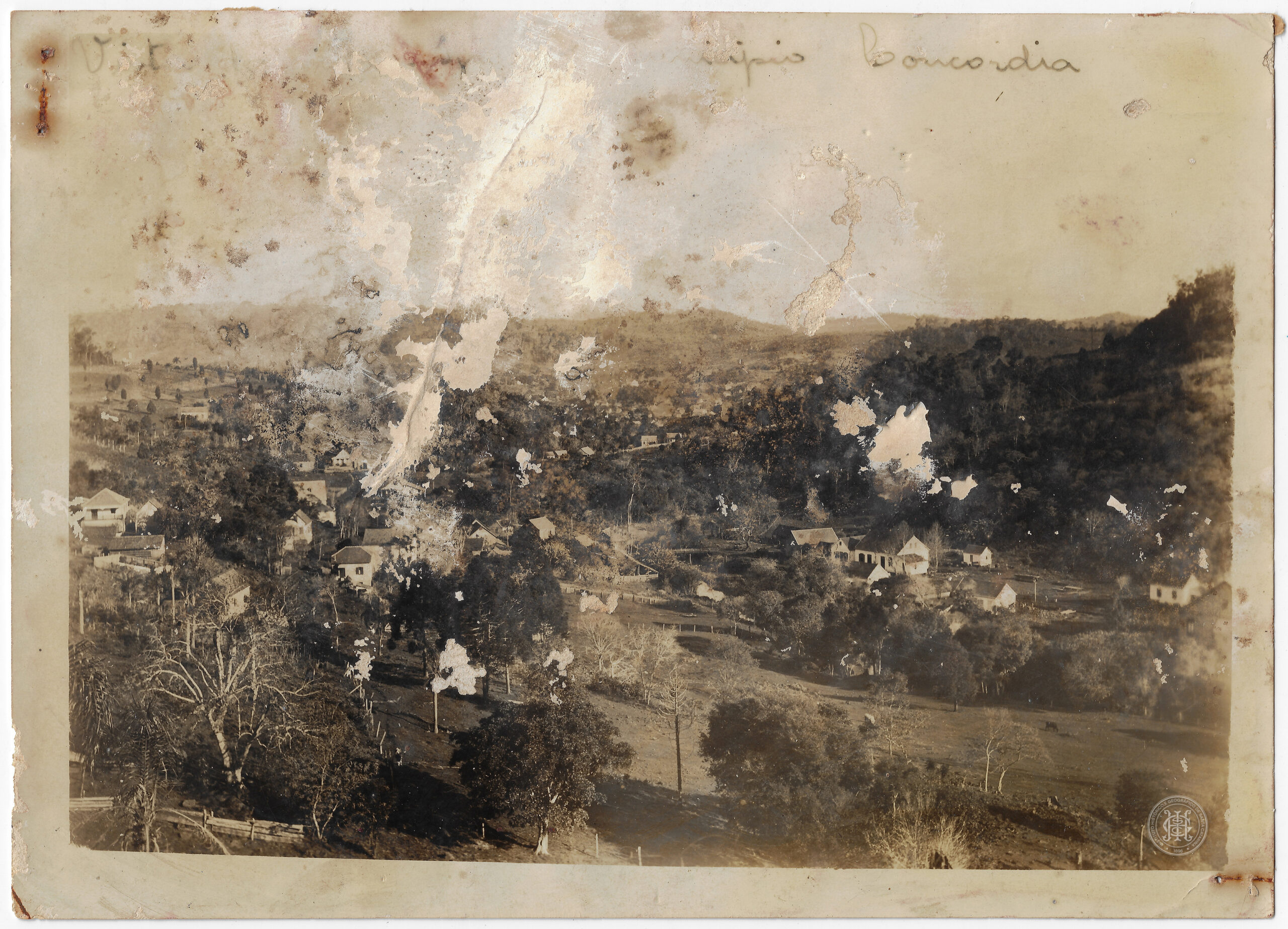 Vista aérea oblíqua do núcleo urbano de Concórdia, Santa Catarina, integrado à paisagem natural. A composição organiza-se a partir de um plano elevado, revelando em primeiro plano e plano médio uma ocupação urbana rarefeita, composta por edificações residenciais térreas e sobrados com telhados de duas águas, dispersos entre áreas de vegetação arbórea densa e clareiras gramadas.