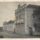 À direita, observa-se o oceano com a presença de ondas e espuma branca, indicando o movimento das águas na zona de arrebentação. No plano médio, centralizado na linha de costa, identificam-se figuras humanas distantes e estruturas de pequeno porte não detalhadas.
