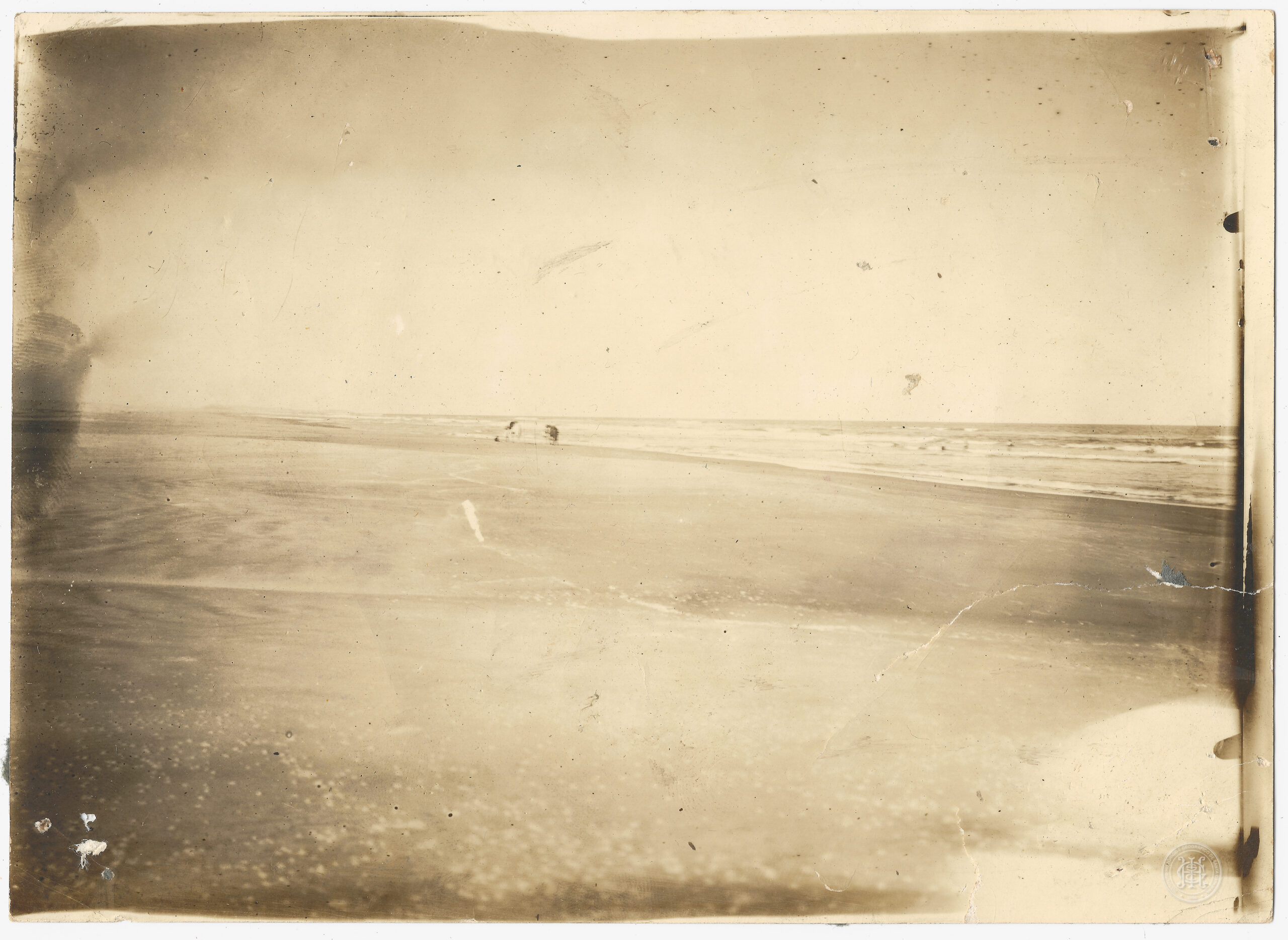 Vista panorâmica da Praia de Jaguaruna, em Santa Catarina. A composição organiza-se a partir de uma extensa faixa de areia clara que ocupa o primeiro plano e o plano médio à esquerda, apresentando uma superfície plana que se estende em direção à linha do horizonte.