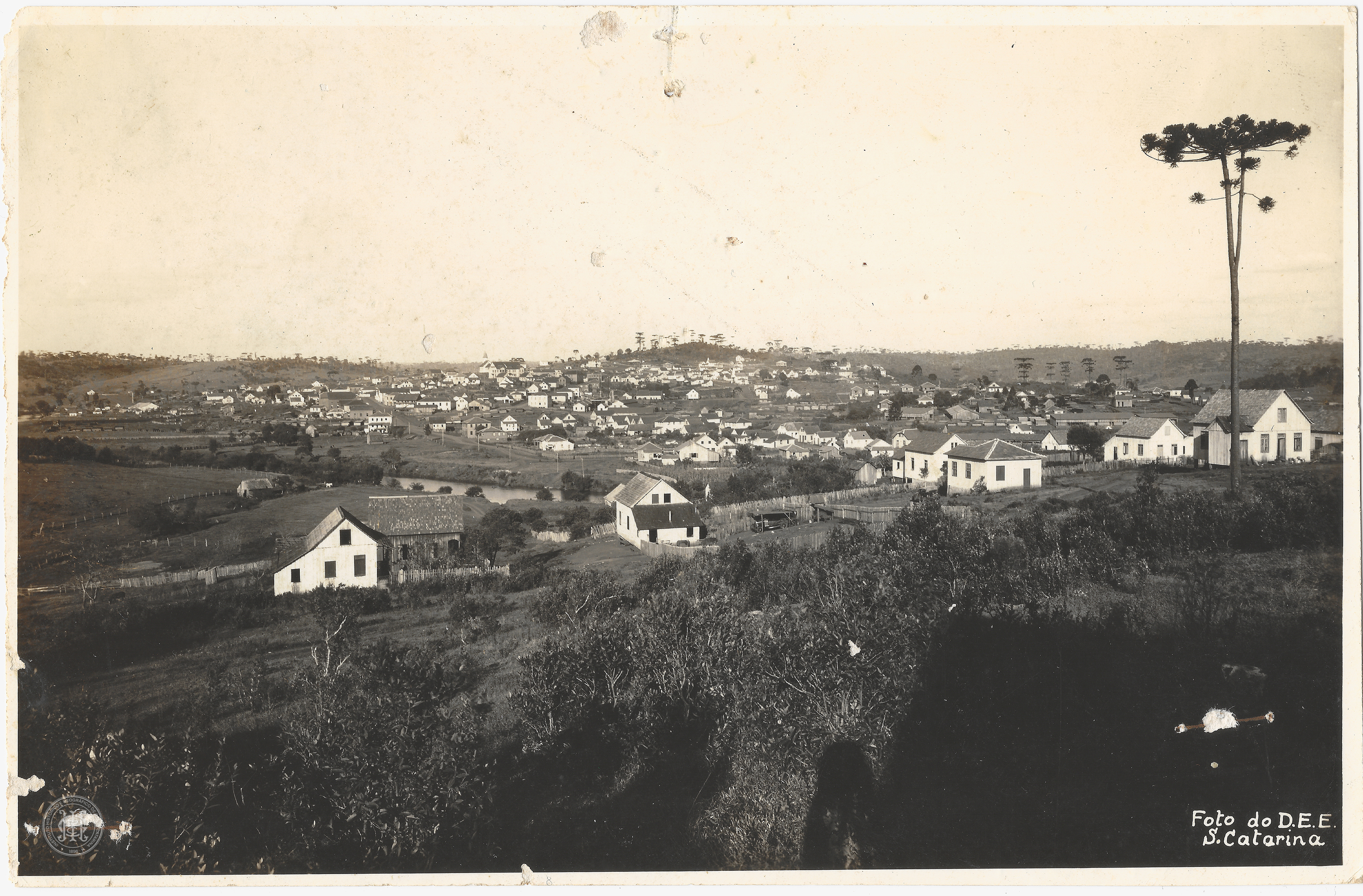 À extrema direita, uma araucária solitária de grande porte domina a verticalidade da composição. No canto inferior direito da imagem, consta a inscrição impressa "Foto do D.E.E. S. Catarina".