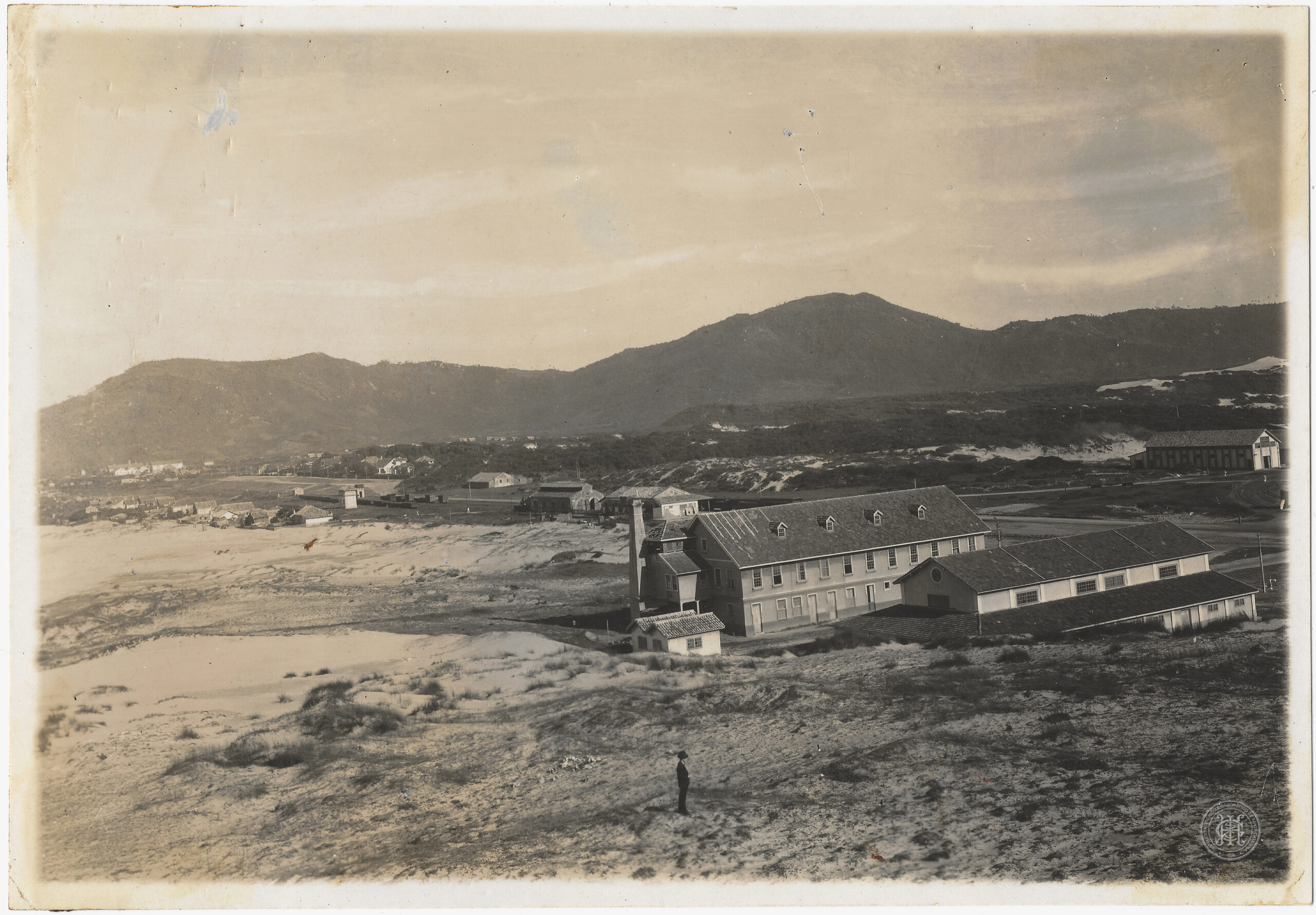 No plano médio, destacam-se edificações de grande porte com telhados de duas águas e telhas cerâmicas; a construção principal apresenta dois pavimentos, múltiplas janelas simétricas e pequenas aberturas no telhado (mansardas), conectando-se a um galpão horizontal e a uma estrutura com chaminé. À esquerda e ao fundo, o núcleo urbano disperso é composto por casas de pequeno porte e infraestrutura ferroviária com vagões visíveis entre a vegetação e as dunas.