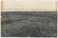 Vista panorâmica de Jaguaruna, Santa Catarina, a partir de um ponto de observação elevado. A composição apresenta, em primeiro plano, uma encosta com vegetação rasteira e densa que ocupa a base da imagem.