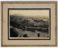 A imagem é capturada a partir de um ponto elevado, apresentando em primeiro plano uma encosta com vegetação rasteira e arbustiva. No plano médio, observa-se o núcleo urbano com diversas edificações de alvenaria e madeira, destacando-se uma grande construção clara e retangular de múltiplos pavimentos ao centro, além de casas com telhados cerâmicos distribuídas pelo relevo.