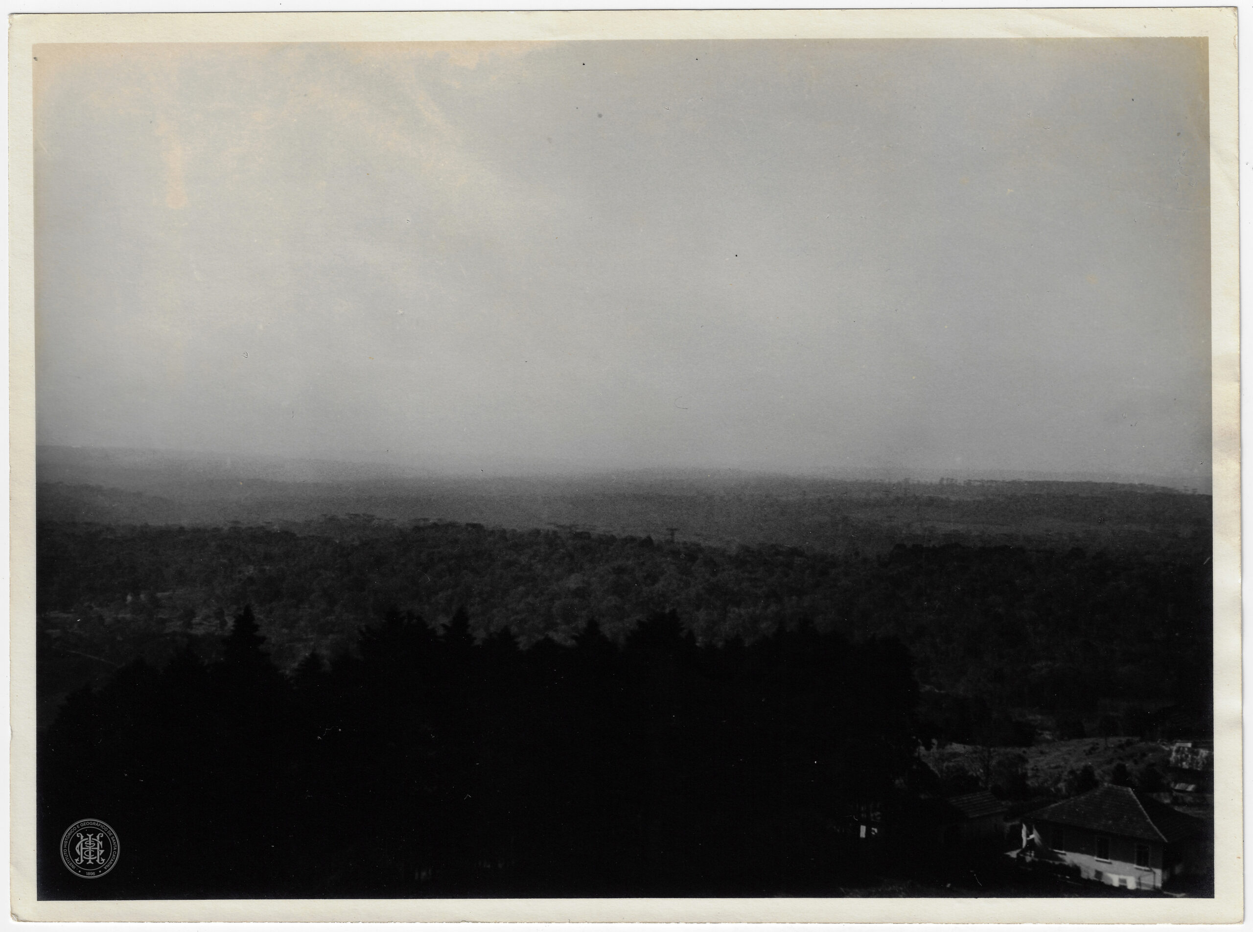 Paisagem, Paisagem Rural, Paisagem Natural, Vista Panorâmica, Floresta, Mata Atlântica, Reflorestamento, Coníferas, Árvores, Horizonte, Bruma, Edificação Rural, Casa de Alvenaria, Arquitetura Rural, Telhado, Relevo, Topografia, Santa Catarina, Interior de Santa Catarina, Geografia de Santa Catarina