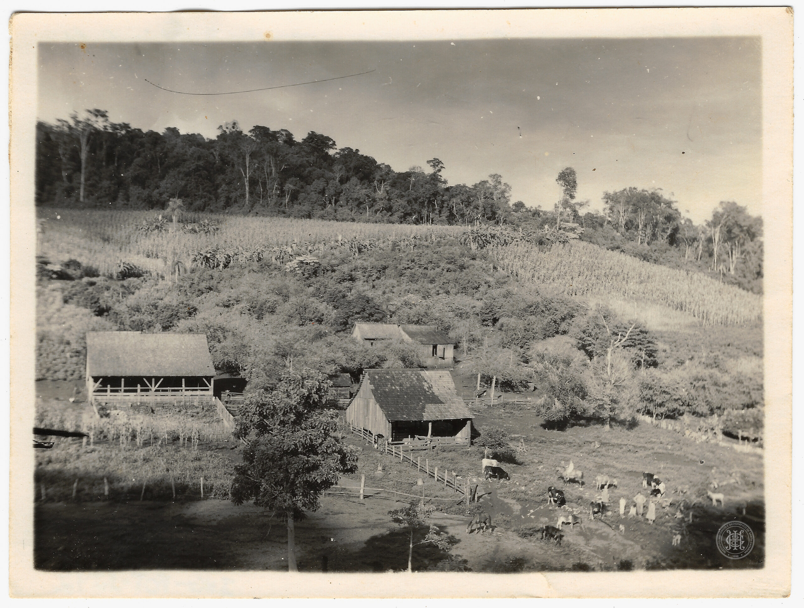 Vista panorâmica de uma propriedade rural, identificada como uma colônia, situada em um terreno de topografia acidentada. No primeiro plano, à esquerda, observa-se uma construção em madeira de grandes proporções com telhado de duas águas, possivelmente um estábulo ou galpão, cercada por uma paliçada de madeira; à direita, um grupo de aproximadamente dez pessoas, incluindo crianças e adultos em trajes rurais, posiciona-se em um pátio de terra batida próximo a animais domésticos, como bovinos e equinos. O plano médio é composto por duas outras edificações residenciais de madeira e telhados cerâmicos, inseridas entre árvores frutíferas e vegetação arbustiva densa que delimita a área construída.