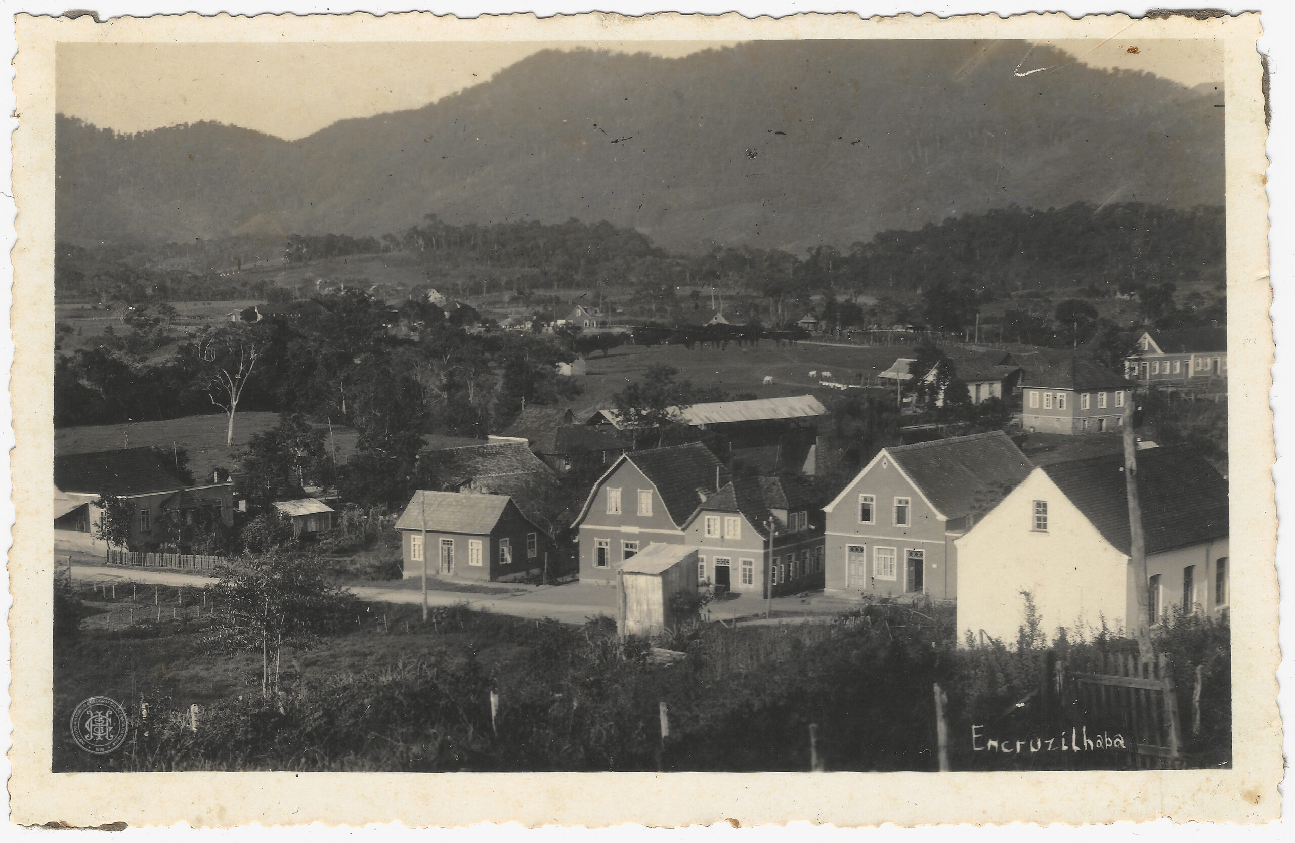 Vista panorâmica do núcleo urbano do distrito de Encruzilhada, atual município de Rio dos Cedros, Santa Catarina, 1938.