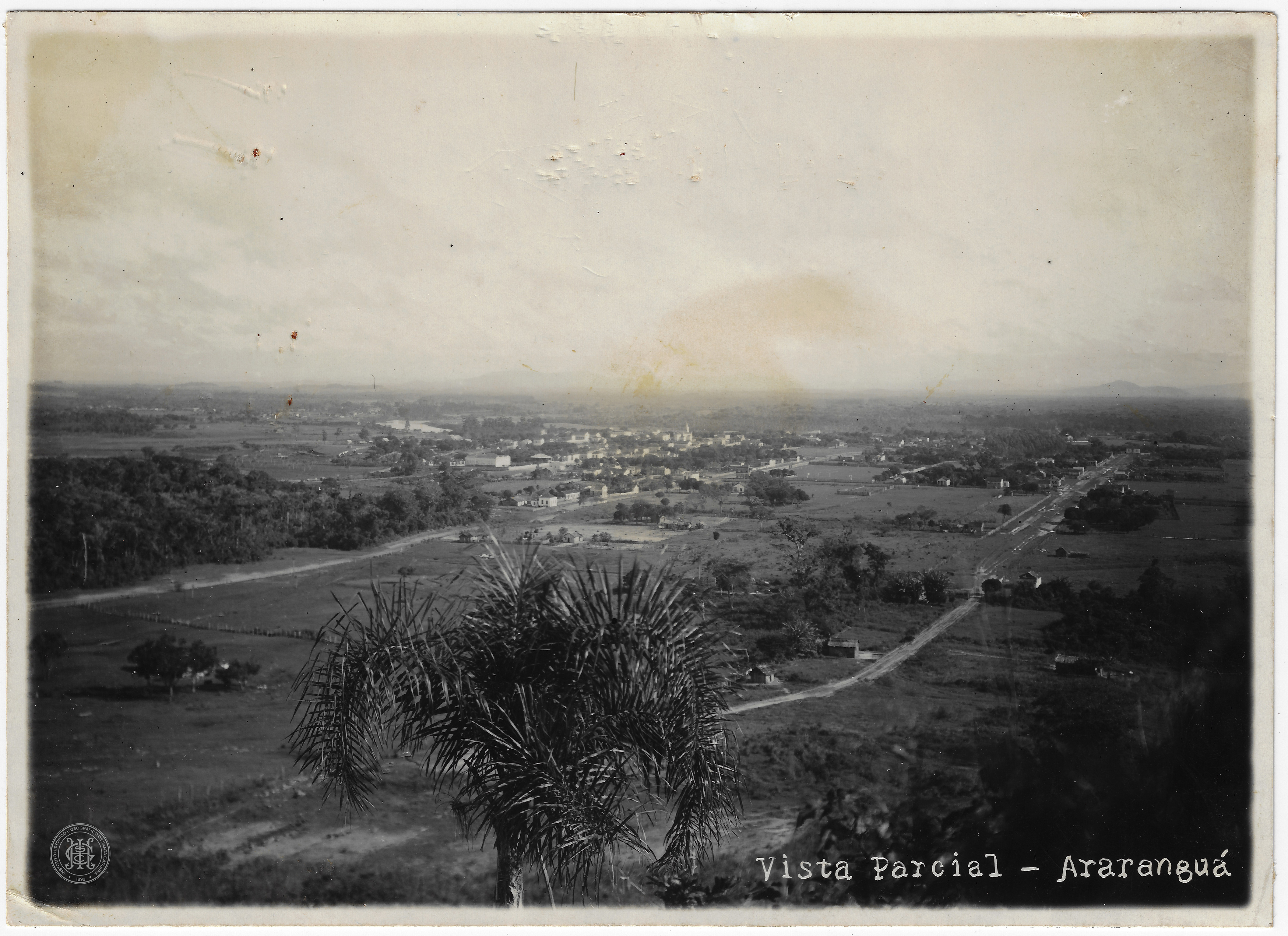 Ao fundo, observa-se o núcleo urbano consolidado da cidade, caracterizado por edificações predominantemente claras, entre as quais se destaca a torre de uma igreja. Um curso d'água, possivelmente o Rio Araranguá, é visível à esquerda, contornando a mancha urbana antes de se perder na linha do horizonte, marcada por morros suaves sob um céu nublado. No canto inferior direito, consta a legenda impressa: "Vista Parcial – Araranguá".
