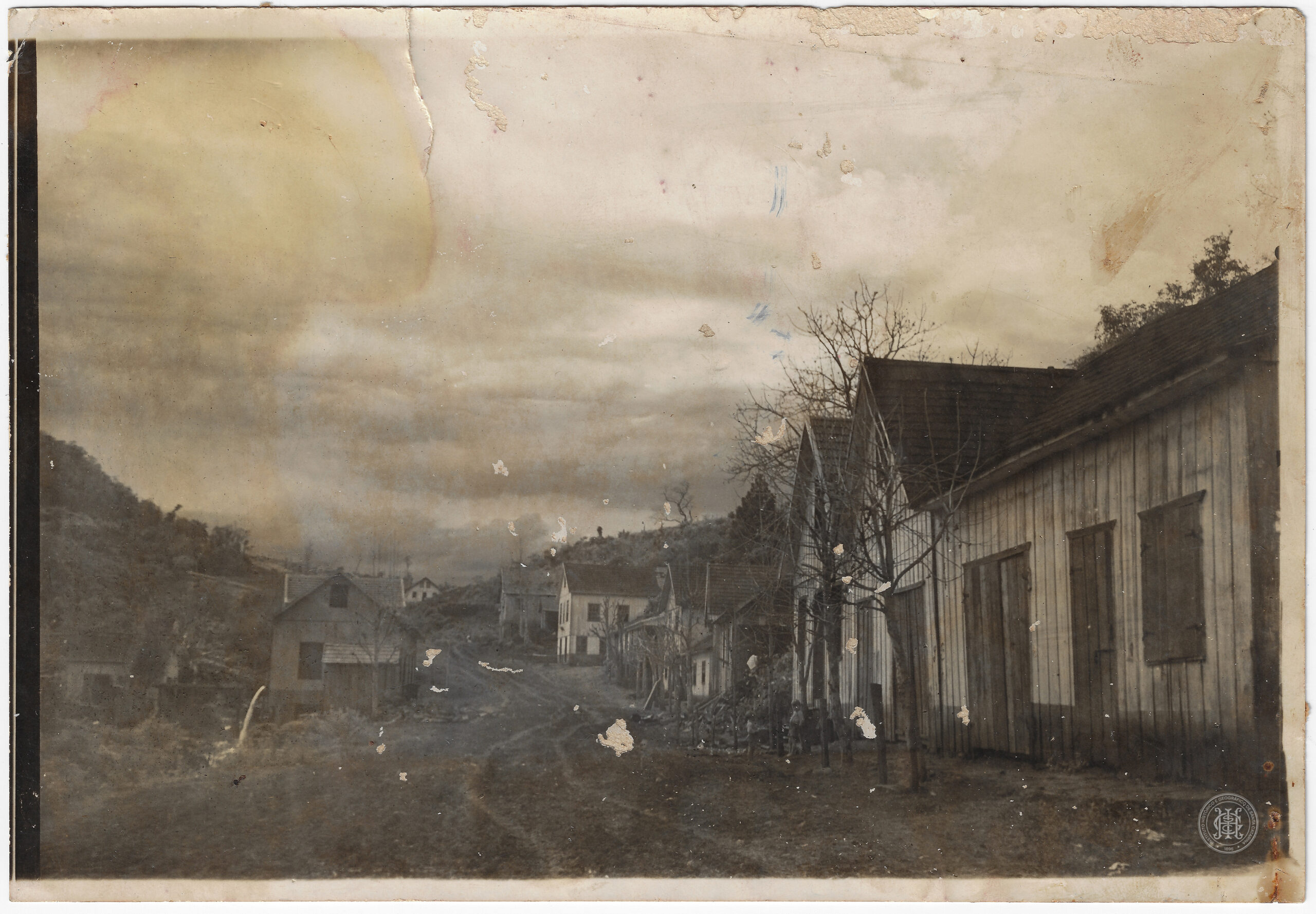 A composição organiza-se a partir de uma estrada de terra que percorre o centro da imagem. No primeiro plano, à direita, destaca-se um conjunto de edificações de madeira com telhados de duas águas, características do período de colonização e expansão ferroviária na região do Meio-Oeste.