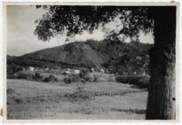 Vista parcial da localidade de Gabiruba, em Brusque, Santa Catarina. A composição é emoldurada em primeiro plano, à direita, pelo tronco e folhagens de uma árvore que obscurecem parcialmente a margem superior.