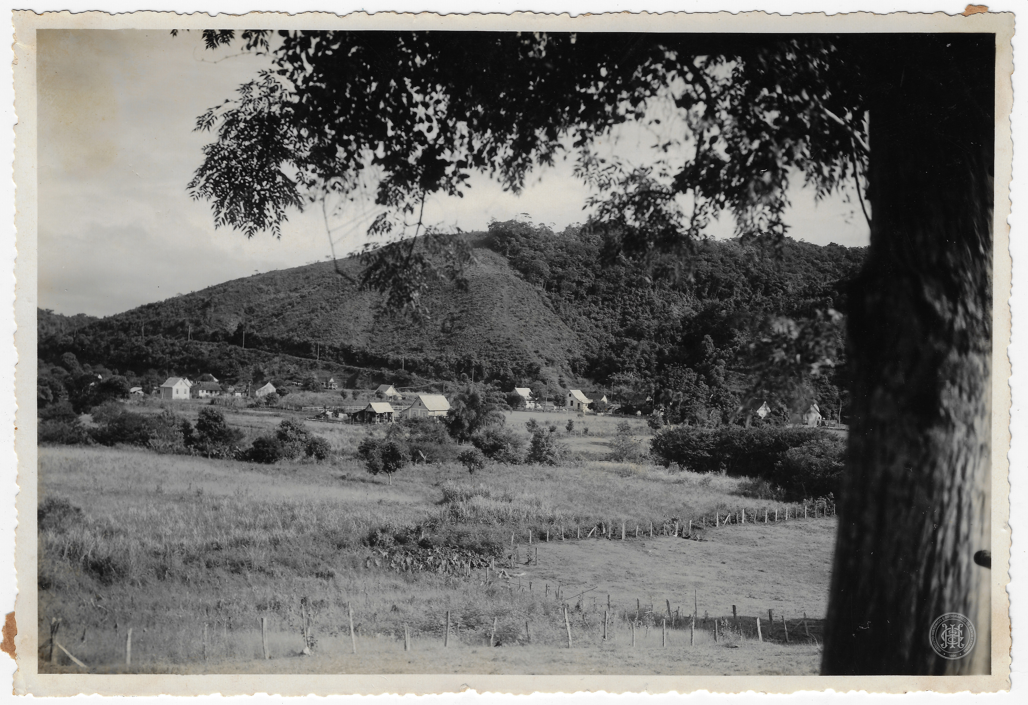 No plano médio, observa-se uma área rural composta por pastagens e campos delimitados por cercas de arame e estacas de madeira, que conduzem o olhar para um núcleo de pequenas edificações residenciais e rurais de madeira distribuídas horizontalmente na base de uma elevação.