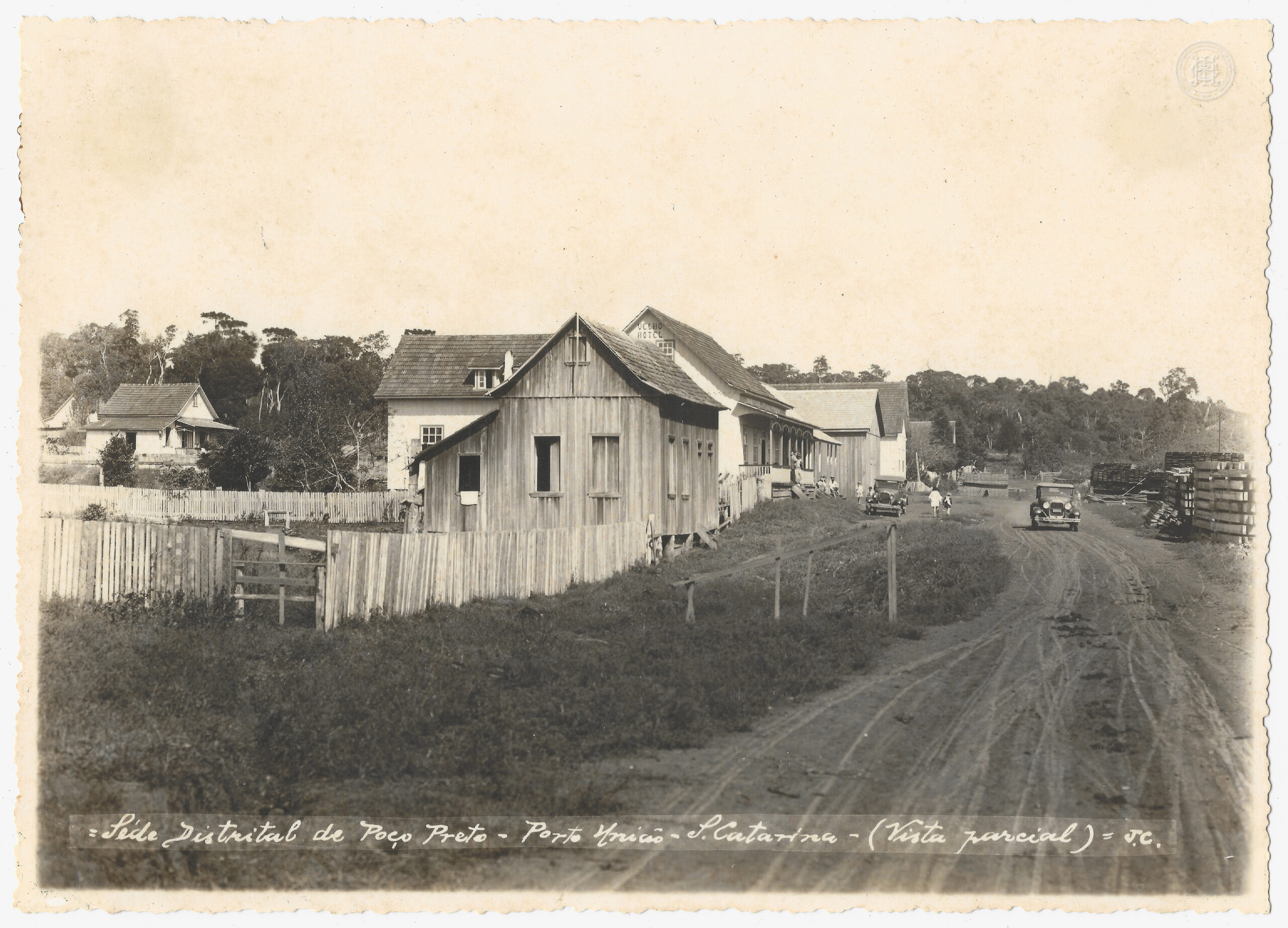 Dois veículos automotores da época estão posicionados na estrada: um estacionado próximo às casas e outro em movimento ao fundo. Na margem inferior, consta uma inscrição manuscrita em tinta branca integrada: "Sede Distrital de Poço Preto - Porto União - S. Catarina - (Vista parcial) - J.C."