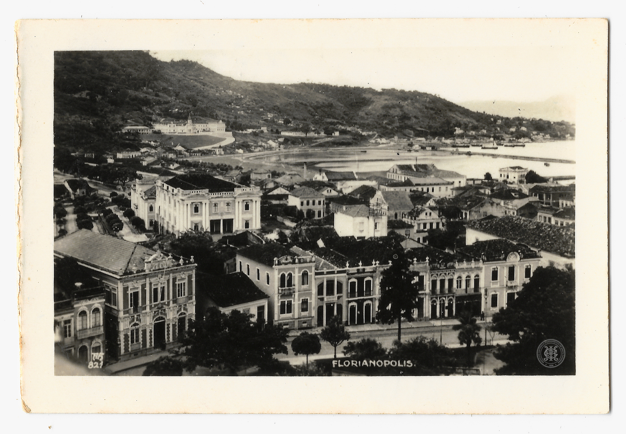 Datada da década de 1920, apresenta uma vista parcial e elevada de Florianópolis, Santa Catarina, destacando a densidade urbana em torno da Praça XV de Novembro. No primeiro plano, observa-se uma sucessão de casarios e sobrados de arquitetura colonial e eclética, com fachadas ornamentadas, sacadas e telhados de barro. À esquerda, destaca-se um edifício de dois pavimentos com frontão decorado, a Escola Normal Catharinense, uma instituição que mais tarde se tornaria o Instituto Estadual de Educação, seguido por uma fileira de construções geminadas que margeiam uma via arborizada. No plano médio, o casario se estende em direção à linha de costa, revelando a proximidade da cidade com o mar, onde se percebe uma enseada com águas calmas e pequenas embarcações atracadas.