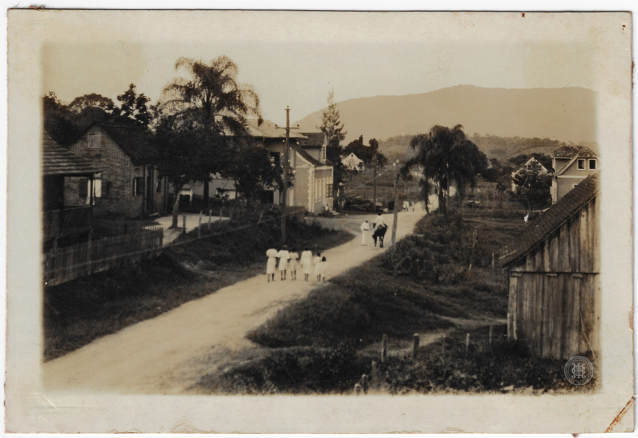 O plano médio apresenta o núcleo urbano em desenvolvimento, caracterizado por edificações de pequeno e médio porte dispersas entre áreas arborizadas e vias de terra. Destaca-se, na porção central, a silhueta da Igreja Matriz com sua torre sineira, que se sobressai na linha do horizonte da cidade.