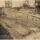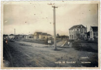 Vista urbana de Tijucas, Santa Catarina. A composição organiza-se a partir de um logradouro em primeiro plano, com solo de terra batida apresentando marcas de rodagem e um poste de madeira centralizado que sustenta fiação elétrica e uma luminária.