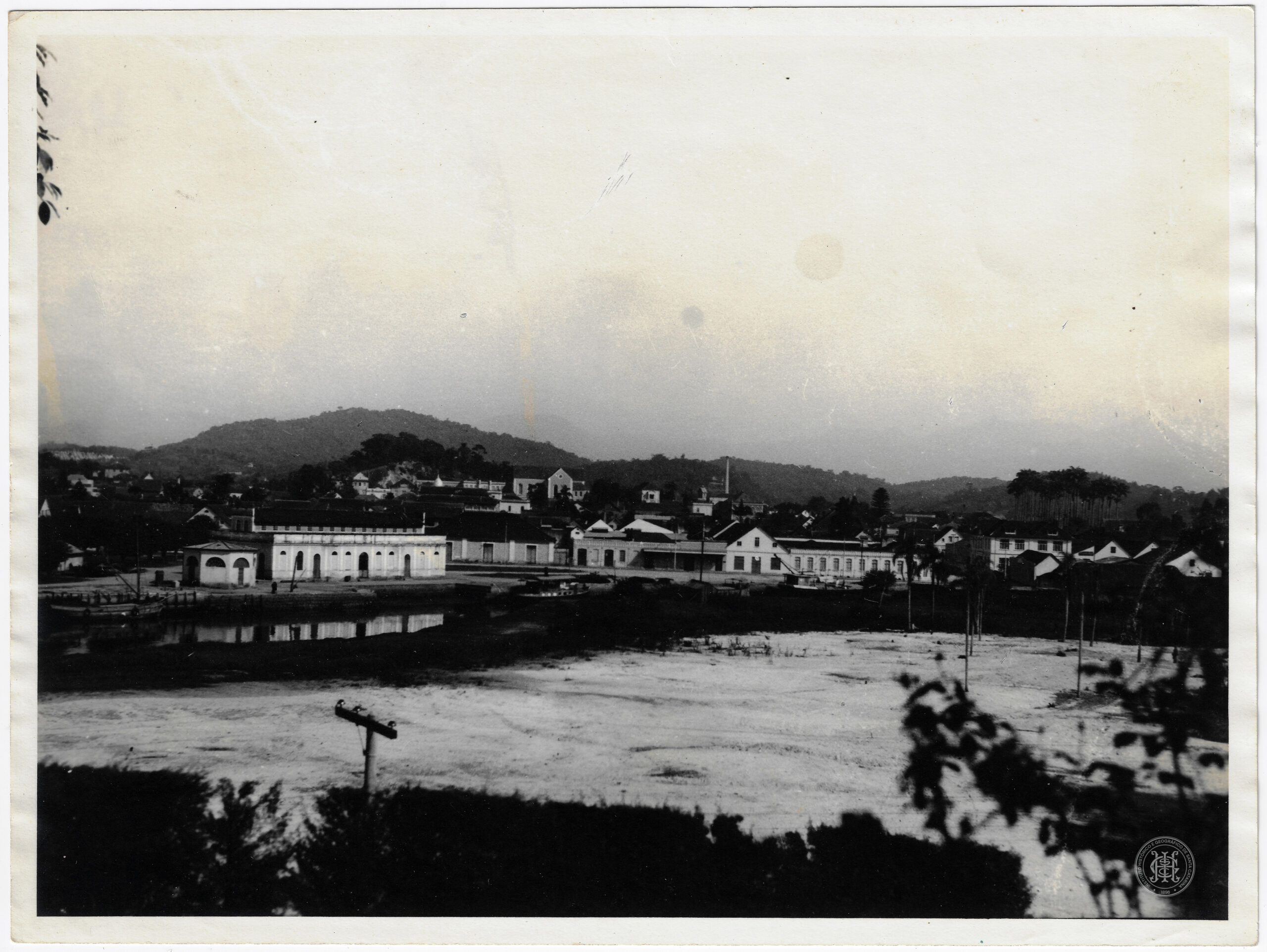 A ocupação urbana no plano médio apresenta uma diversidade de tipologias arquitetônicas. À esquerda, sobressai um edifício público ou comercial de cor clara, com uma sequência de arcos na fachada e platibanda decorada. Seguindo para a direita, estende-se um conjunto de sobrados e casas térreas com telhados de múltiplas águas, além de uma chaminé industrial esguia ao centro.