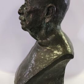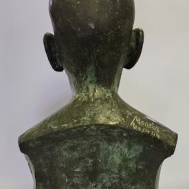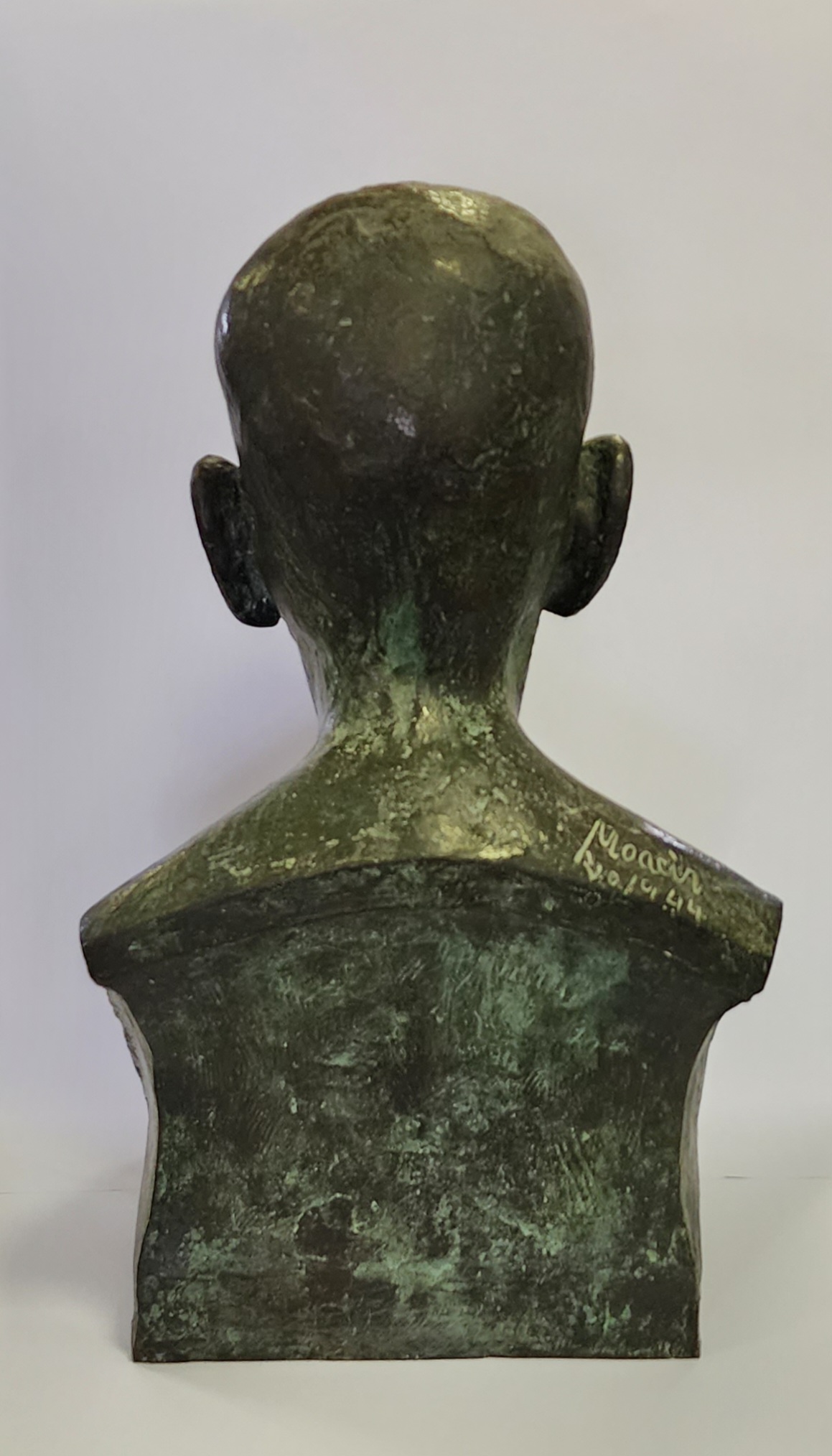 A escultura apresenta uma estrutura monobloco composta por cabeça, pescoço e a porção superior do tronco, finalizada em uma base de corte reto e formato trapezoidal. A morfologia do rosto inclui olhos semicerrados, nariz proeminente e orelhas detalhadas, com o crânio apresentando uma calvície frontal e cabelos curtos nas laterais e região posterior.
