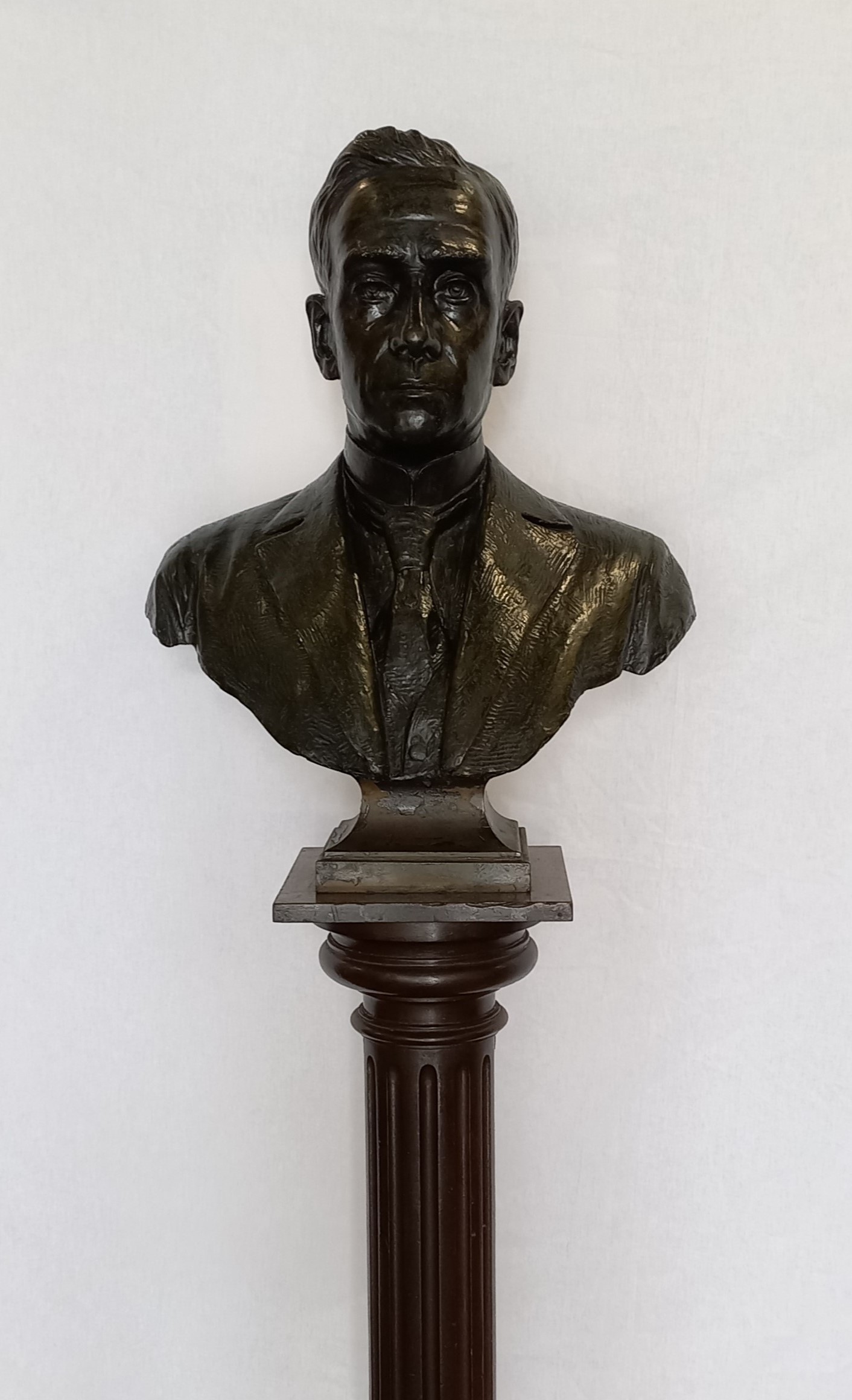 A vestimenta possui modelagem detalhada, destacando as lapelas do paletó e o nó da gravata, com uma superfície que alterna entre áreas polidas e texturizadas pela técnica de moldagem.