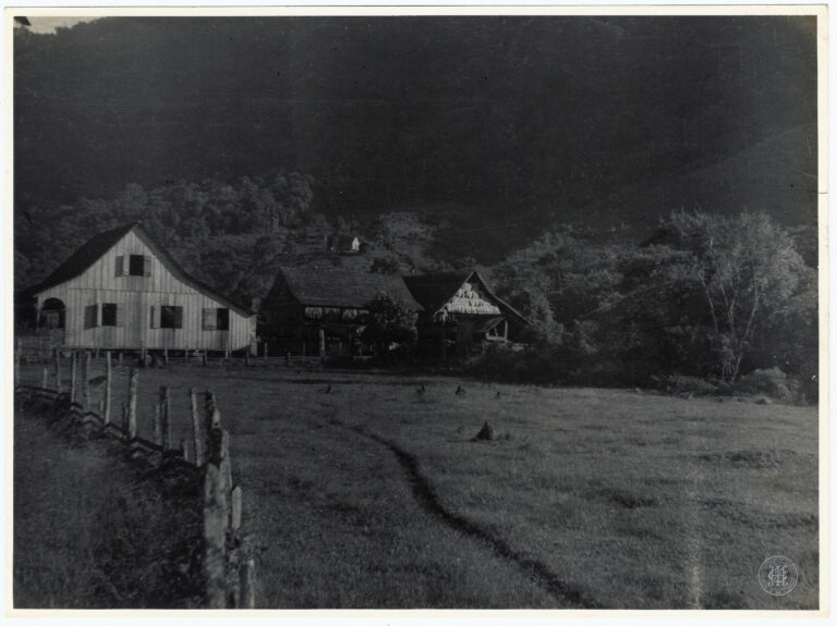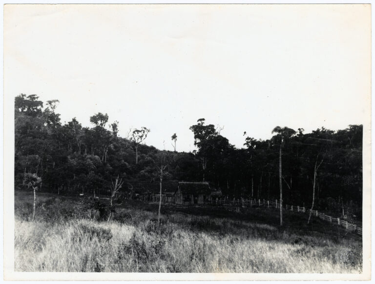 Perspectiva de conjunto de uma maquete do projeto arquitetônico da Escola de Engenharia Industrial da Universidade de Santa Catarina, datada de 1965. A imagem apresenta uma vista aérea...