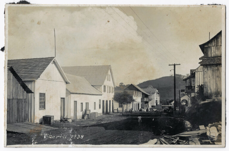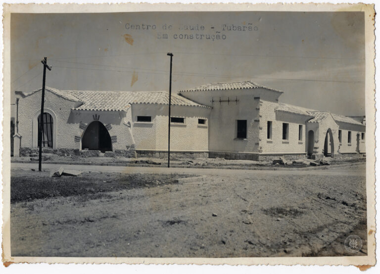 Fachada externa dos Pavilhões da Exposição Nacional de Mapas Municipais, no Rio de Janeiro. A composição, em plano de conjunto, destaca uma estrutura arquitetônica composta por dois pavilhões...